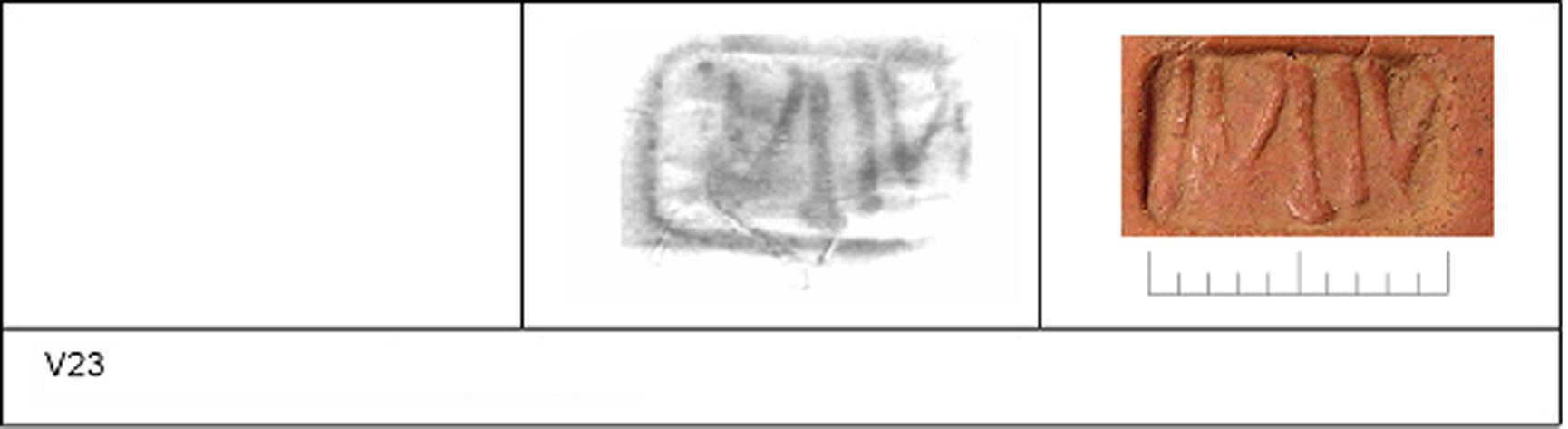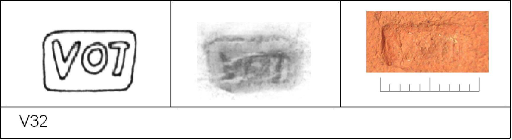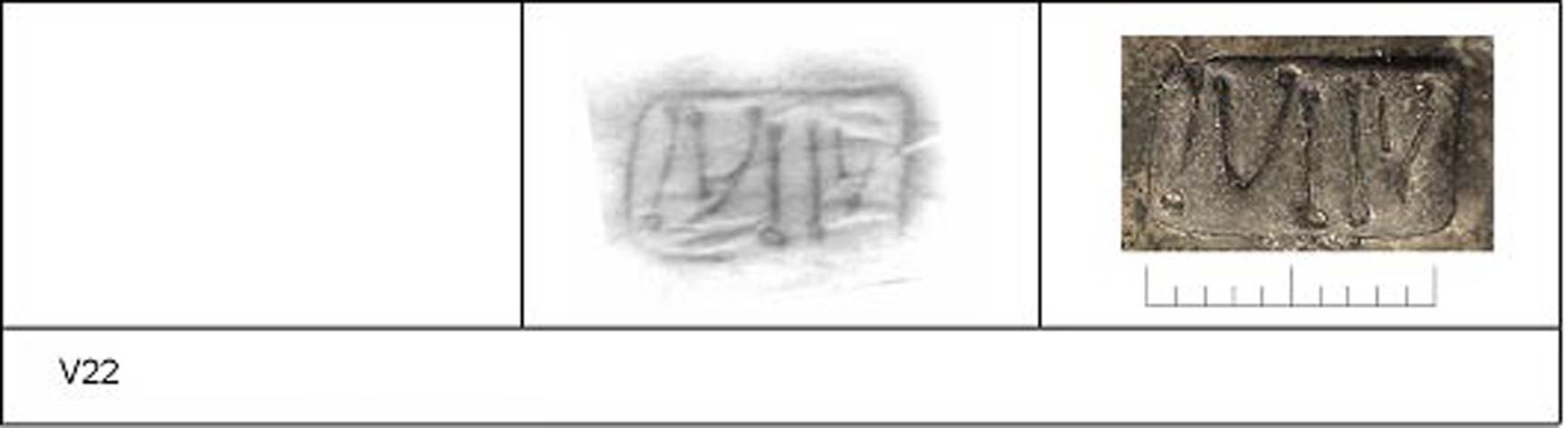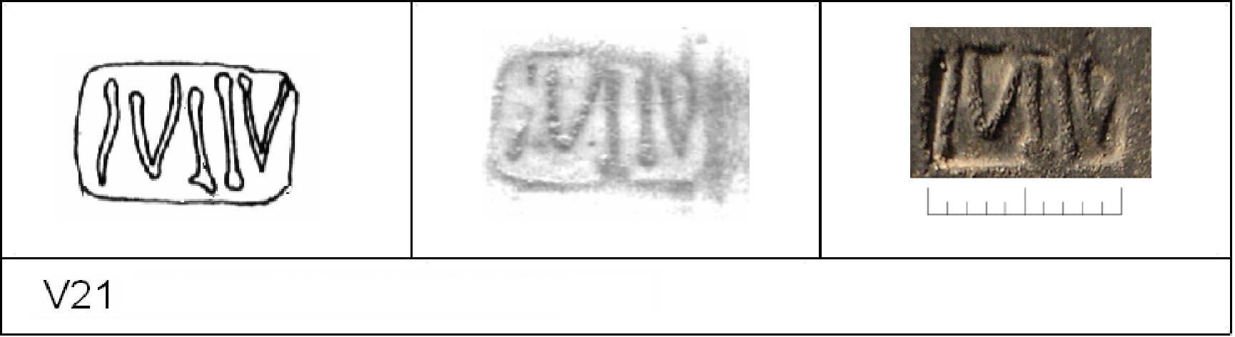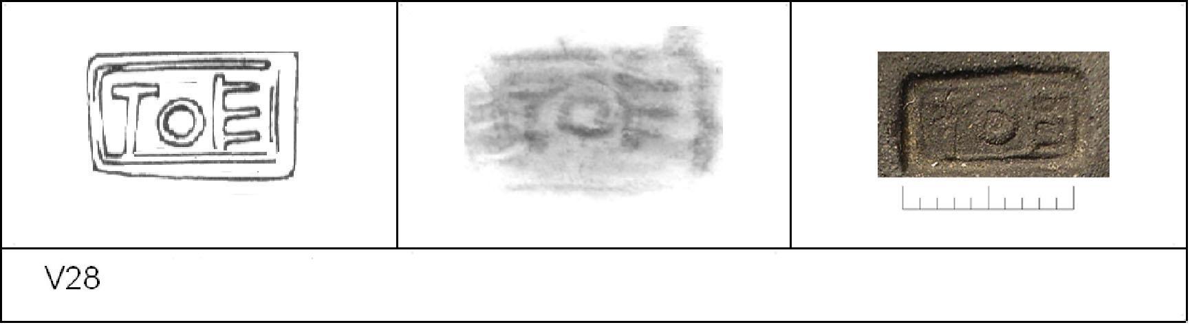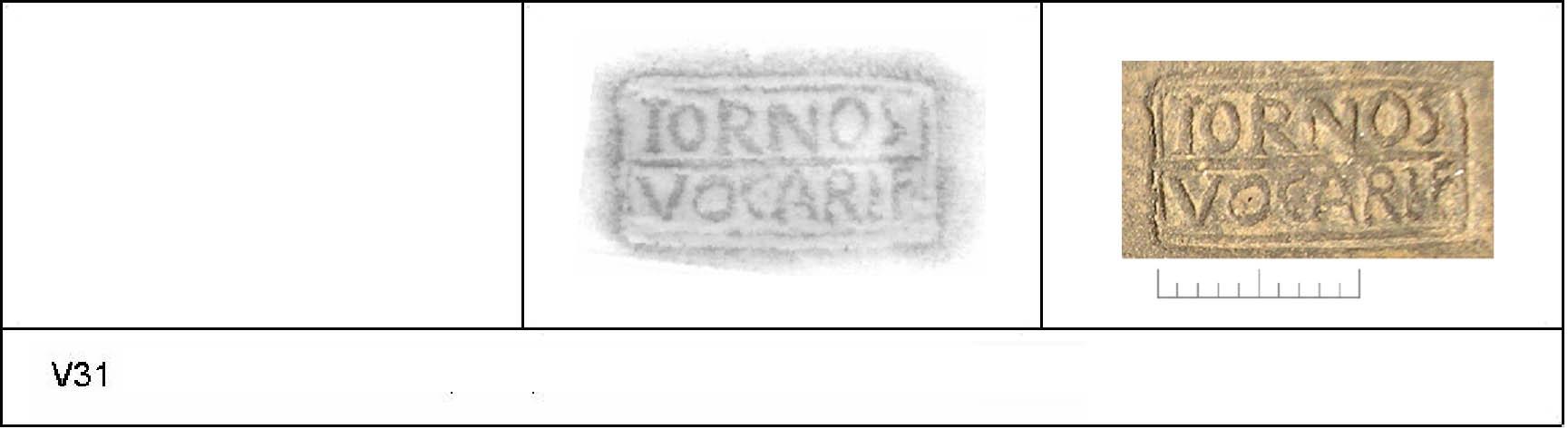 | 30 | 223 | King Harry Lane | Verulamium | Cam 7C | TN 1A | BM | P1976 5-1 557 | 21 | 02A01 | C | Y | Die 02A01 - TORNOS / VOCARIF(ECIT). NA FABRIC C. Cam 7C. TN 1A. - hard white sandy matrix; metallic steel grey slip on upper surface, polished; lower pale grey, matt Border. Reading:- TORNOS / VOCARIF(ECIT). 1. 1 RW. CONTEXT - KHL 223,1 - PHASE 1. Infant. Secondary in earliest enclosure. |