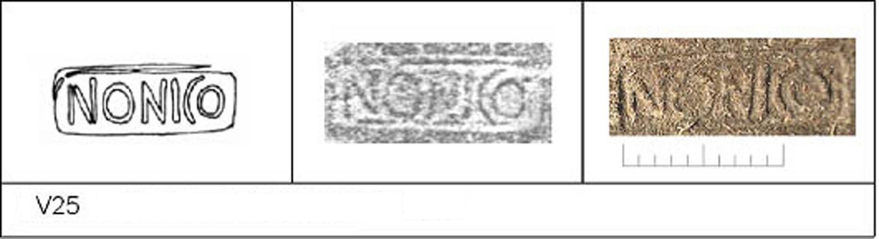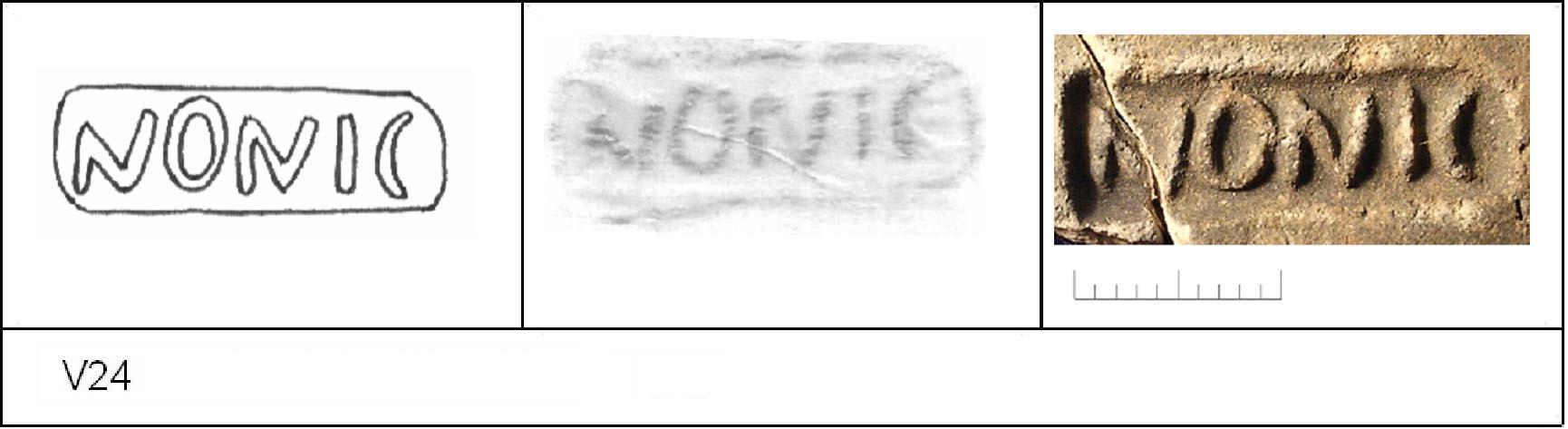 | 24 | 53 | King Harry Lane | Verulamium | Cam 13 | TN | BM | 1976 5-1 129 | 86 | 01A01 | C | Y | Die 01A01 - NONIC NA FABRIC A 14180X. Cam 13. TN - pale sandy matrix; blue-black surfaces; no finish. Cursive style with unusually large and clear letters. Reading:- NONIC. 1. 2 RW. CONTEXT - KHL 53 - PHASE 2. Immature adult + adult. Between earliest and latest enclosures, north range. . |