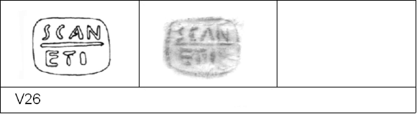 | 26 | 346 | King Harry Lane | Verulamium | Cam 56A | TR 1B | BM | P1976, 5-1, 916 | 20 | 01A01 | C | Y | Die 01A01 - SCAN / ETI NA FABRIC D 14183R. Cam 56A; tall carinated foot-ring. TR1B - buff fine sandy matrix; orange slip; no finish; clearly slipped overall. Reading SCAN / ETI. CONTEXT - KHL 346 - PHASE 1. Male. Central to cluster beyond enclosures. |