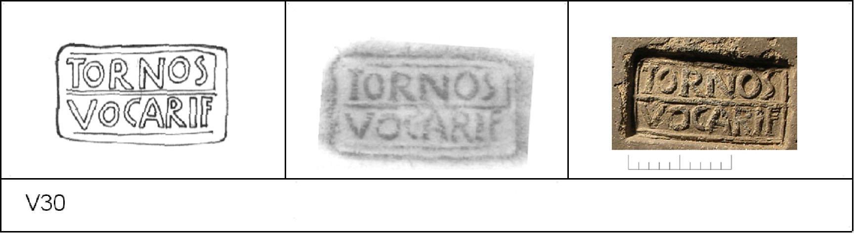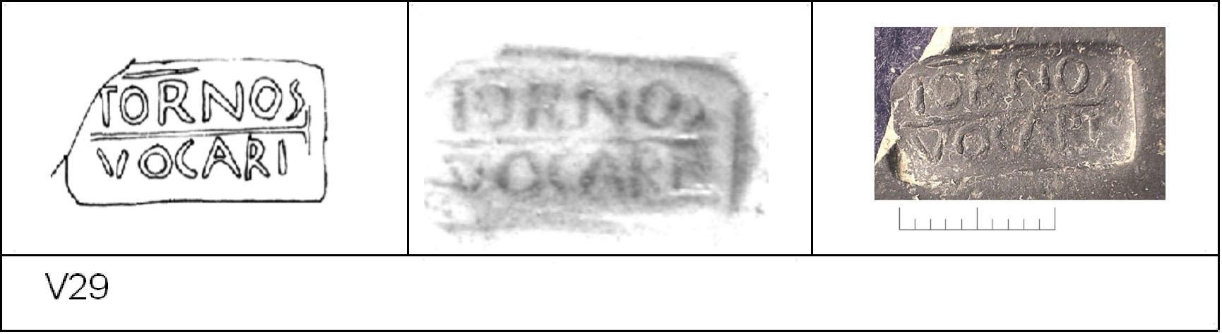 | 29 | 280 | King Harry Lane | Verulamium | Cam 7 | TN | BM | 1976 5-1 708 | 21 | 01A01 | C | Y | Die 01A01 NA FABRIC C. Cam 7. TN - pale fine sandy matrix; blue-black surfaces; polished finish. Border. Reading:- TORNOS / VOCARI. 1. 1 BRW. CONTEXT - KHL 280 - PHASE 1. Adult. In the passageway between north and south ranges. |
