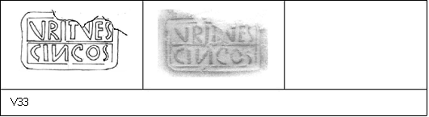 | 33 | 280 | King Harry Lane | Verulamium | Cam 7 | TR 1B | BM | 1976 5-1 707 | 23 | 02A03 | C | Y | Die 02A03 NA FABRIC D. 14166T Central. TR1B. Formal style. Border. Reading:- VRITVES/CII/ICOS. 1. 1RW. KHL 280 - PHASE 1. Adult. Rich grave. In the passageway between north and south ranges. . |