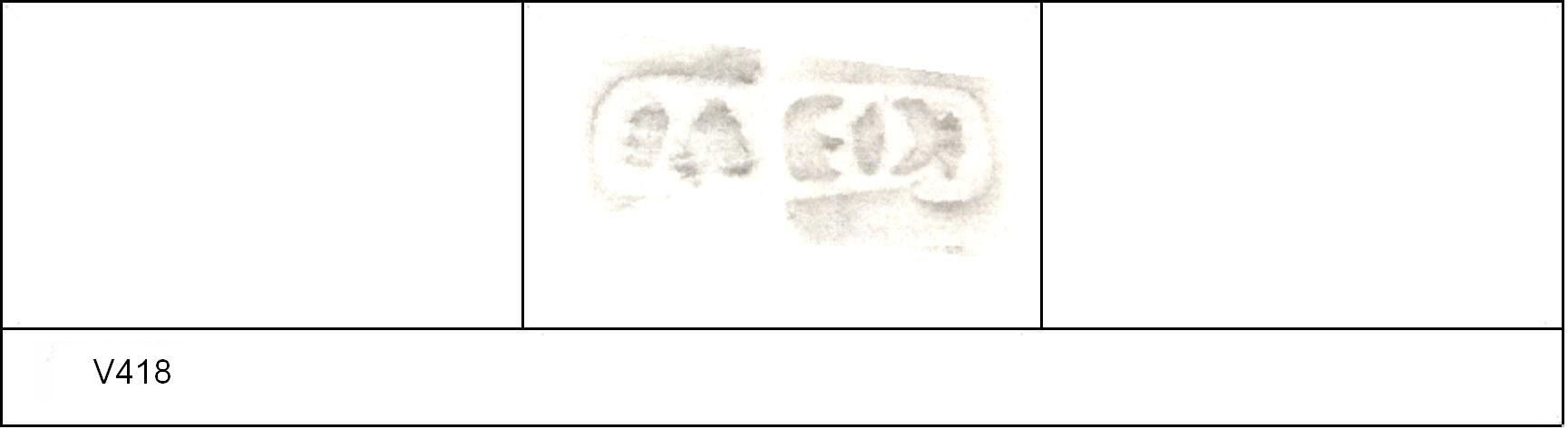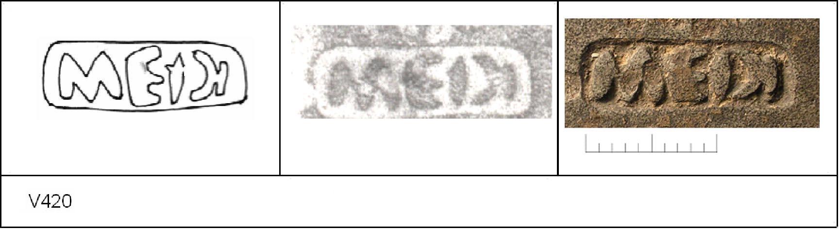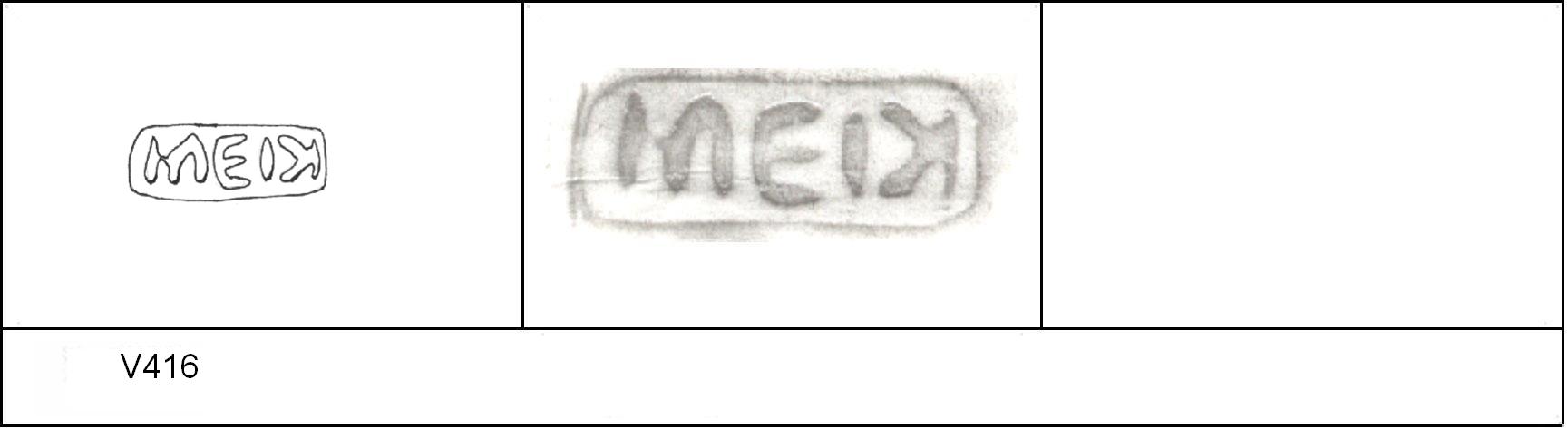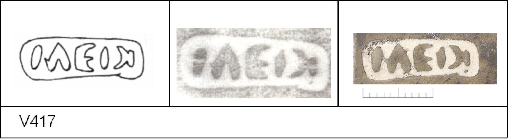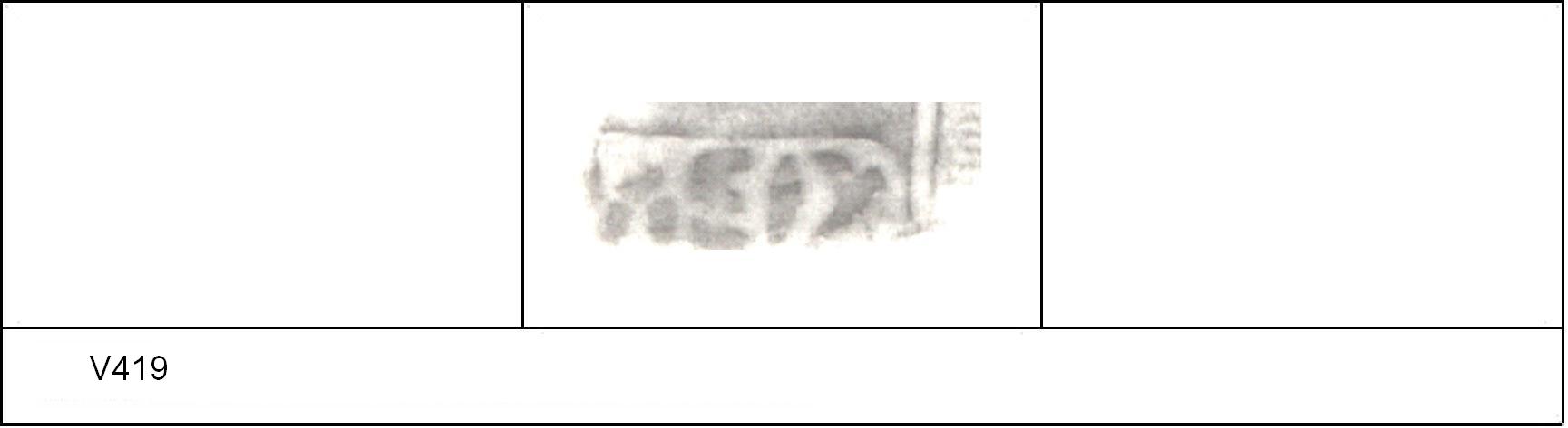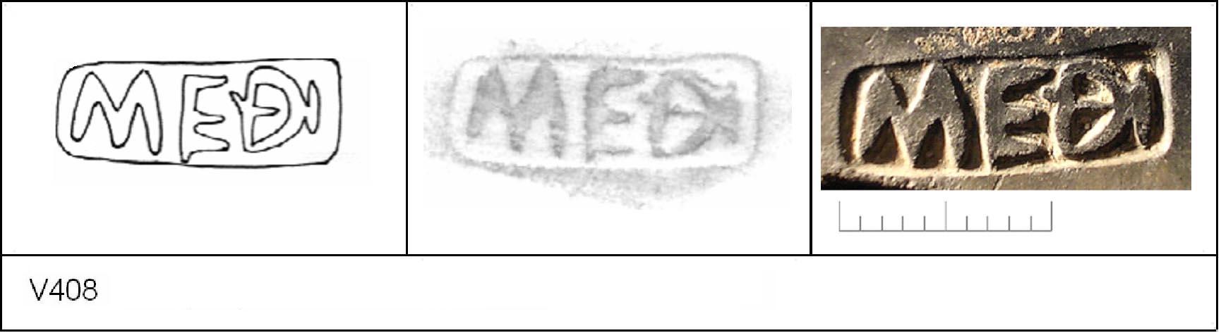 | 418 | 1932H&H | Sheepen I | Colchester | Platter | TN | Colchester Museum | C32BS20 | 36 | 01A04 | R | N | Die 01A04 - MEDI ? Die 01A02 broken, repaired in antiquity and re-used. Same pot as V417 [75]. Reading :- M[]EDI. |