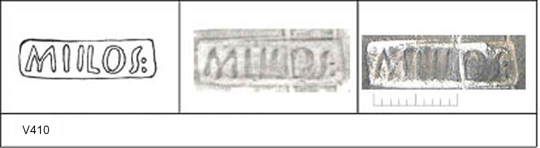| 411 | 1931H&H | Sheepen I | Colchester | Platter | TN | BM | C31BS30 | 82 | 01B01 | R | Y | Die 01B01 MIILOS, back sloping M, hooked L. NA FABRIC B 14199X Radial. TN - white hard matrix; metallic pale blue surfaces; highly polished upper, polished lower surface. Border. Reading:- MIILOS. 1. 2 pairs IC defining matt zone inside stamp + 1 IC outside. . |