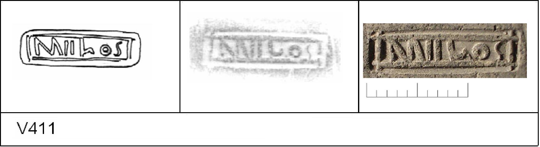 | 410 | 1931H&H | Sheepen I | Colchester | Cam 12 | TN | Colchester Museum | C31BS49 | 82 | 01A01 | R | Y | Die 01A01 - MIILOS Cam 12, 3 Radial. TN - B/B surfaces; polished upper, matt lower. Reading:- MIILOS:. Note the : at end of name. 1. 1 BRW. Looks like the same die-maker as CANICOS |