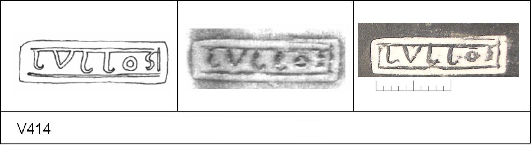 | 414 | 1932H&H | Sheepen I | Colchester | Platter | TN | Colchester Museum | C32BS47 | 55 | 01A01 | R | Y | Radial. TN - hard white sandy matrix; B/B surfaces; polished upper, faceted lower. Border. Reading:- LVLLOS. No decoration | ||