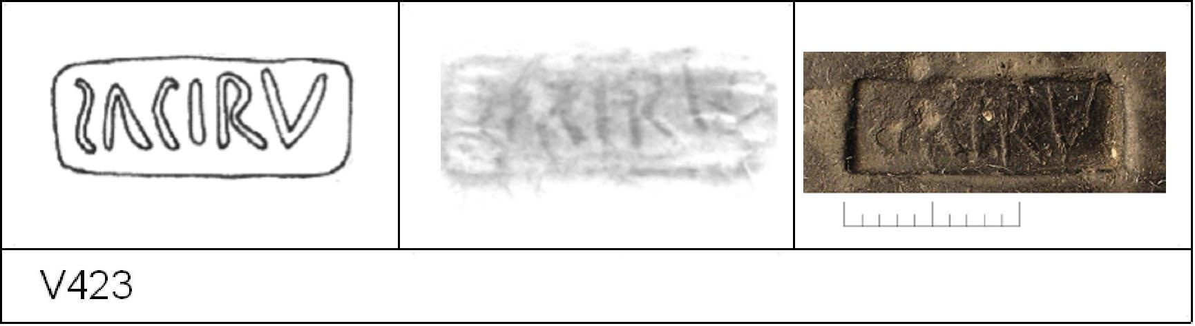 | 423 | Unknown | Joslin Coll | Colchester | Cam 56 | TN | Colchester Museum | Joslin Coll 127 | 37 | 01A01 | C | Y | Die 01A01 Cam 56L. TN - sandy grey matrix; black surfaces; polished upper, matt lower. Uncertain Reading:- S(reversed)ACIRV. Large letters. 1. 1 IC. CONDITION - trimmed around foot-ring. |