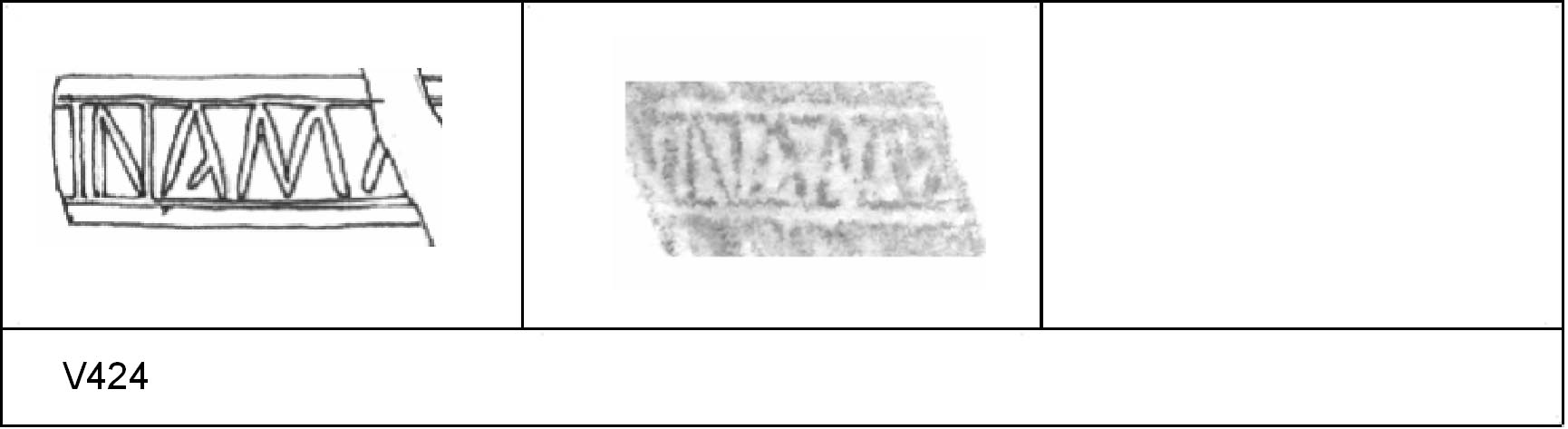 | 424 | 1931H&H | Sheepen I | Colchester | Platter | TR 1C | Colchester Museum | C31BS2 | 124 | 01A01 | R | Y | Radial. TR1C - pale sandy matrix; rose slip; no finish. Border. Reading:- NAMA[NTo]. No decoration | ||