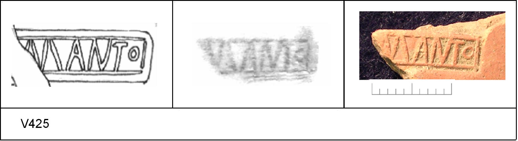 | 425 | 1932H&H | Sheepen I | Colchester | Platter | TR 1C | Colchester Museum | C32BS32 | 124 | 01A01 | C | N | Central. TR!C - pale sandy matrix; rose slip; polished upper, matt lower. Border. Reading:- [NA]MANTo. No decoration. CONTEXT : unstratified. | ||