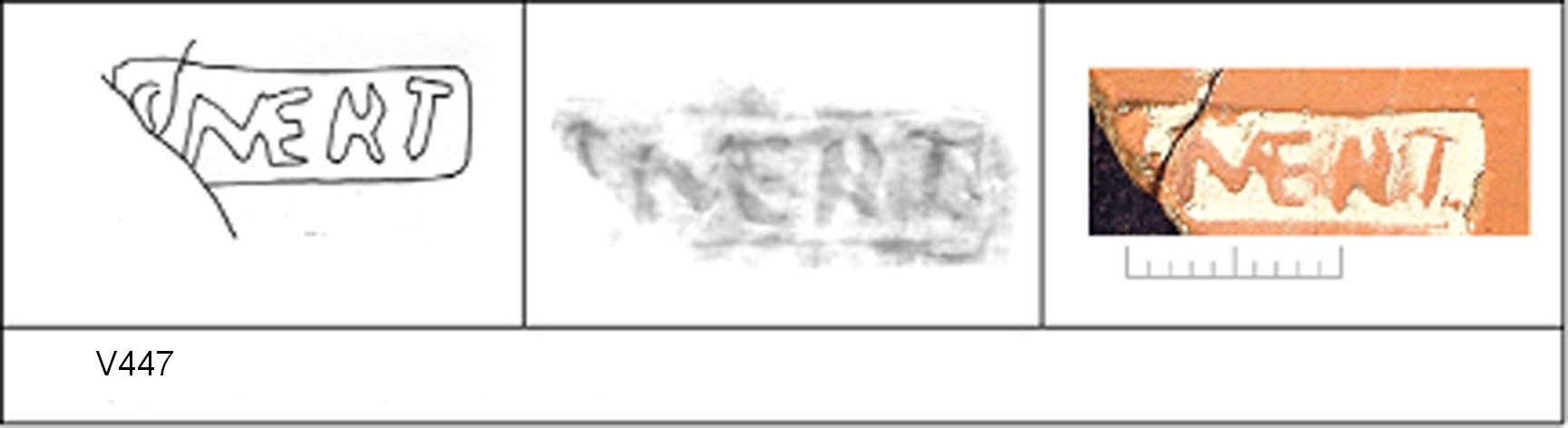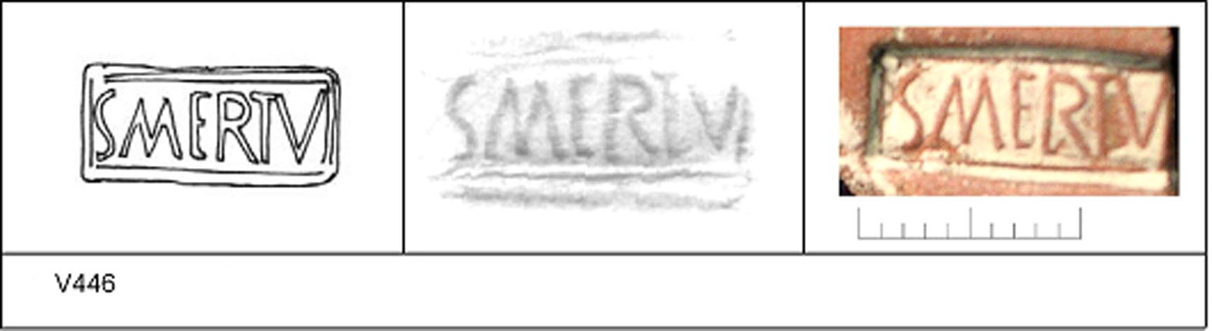 | 446 | 1935H&H | Sheepen I | Colchester | Platter | TR 1C | Colchester Museum | C35BS2 | 56 | 02B01 | C | Y | Die 02B01 - SMERTV. Central. TR1C - red sandy matrix; darker slip; polished upper. Border. Reading:- SMERTV. |