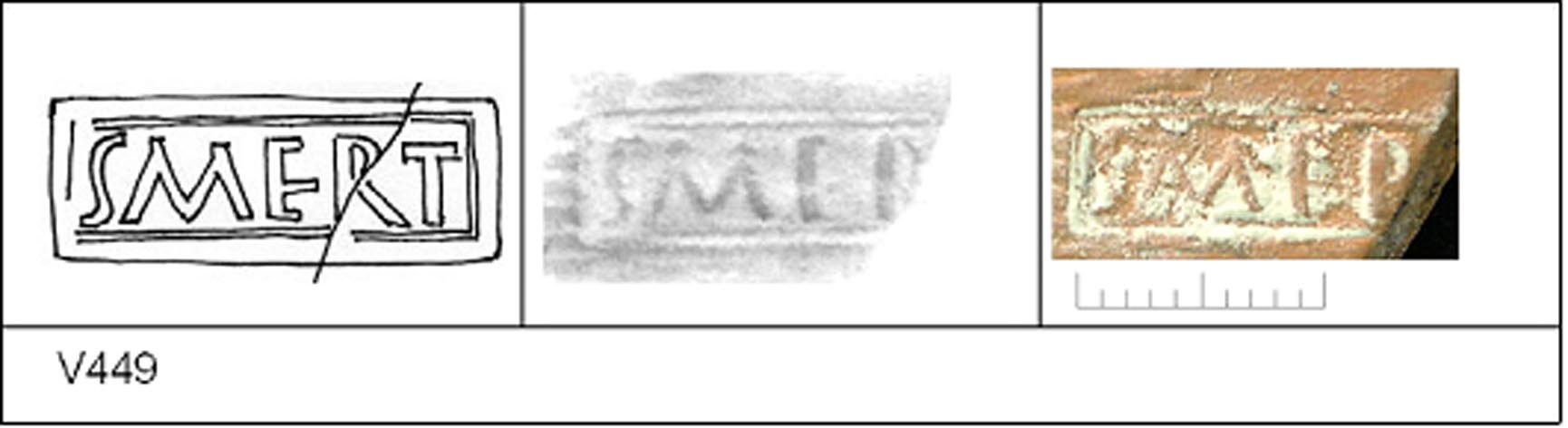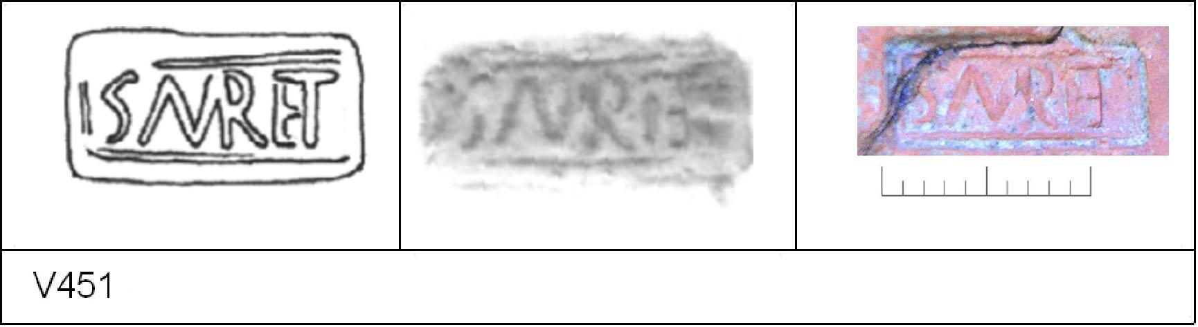 | 450 | Unknown | Sheepen I | Colchester | Platter | TR 1C | Colchester Museum | A64 | 56 | 03A01 | R | N | Die 03A01 - SMERT Radial. TR1C. Border. Reading:- SM[ERT.]. 1. 1 Triple strand RW. ?Same platter as V449 |