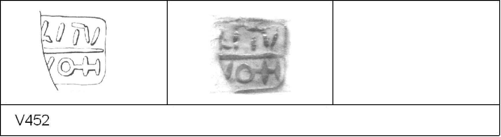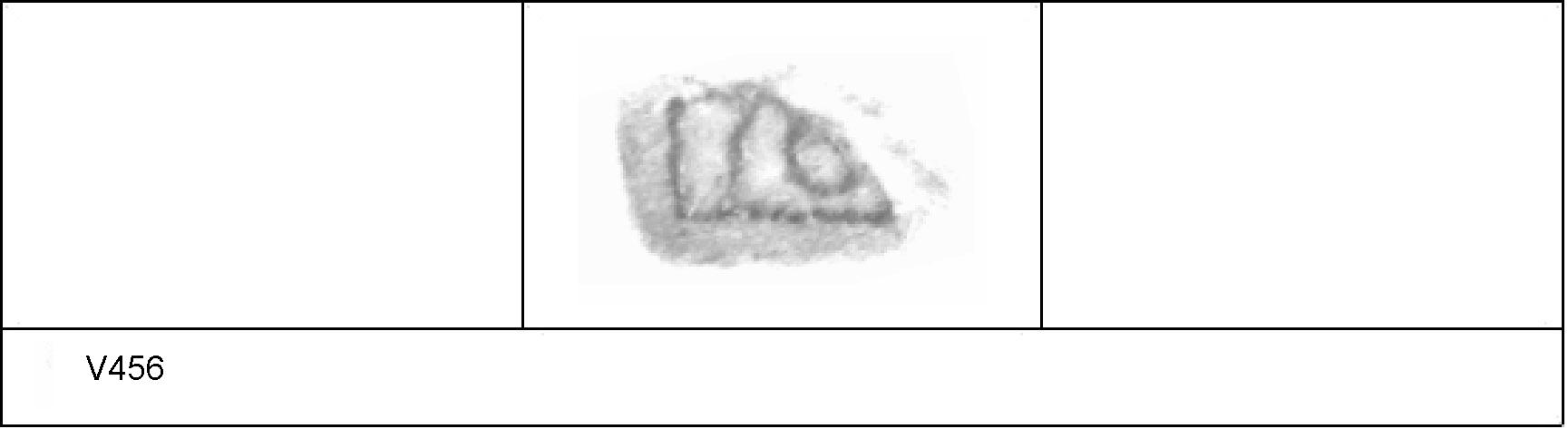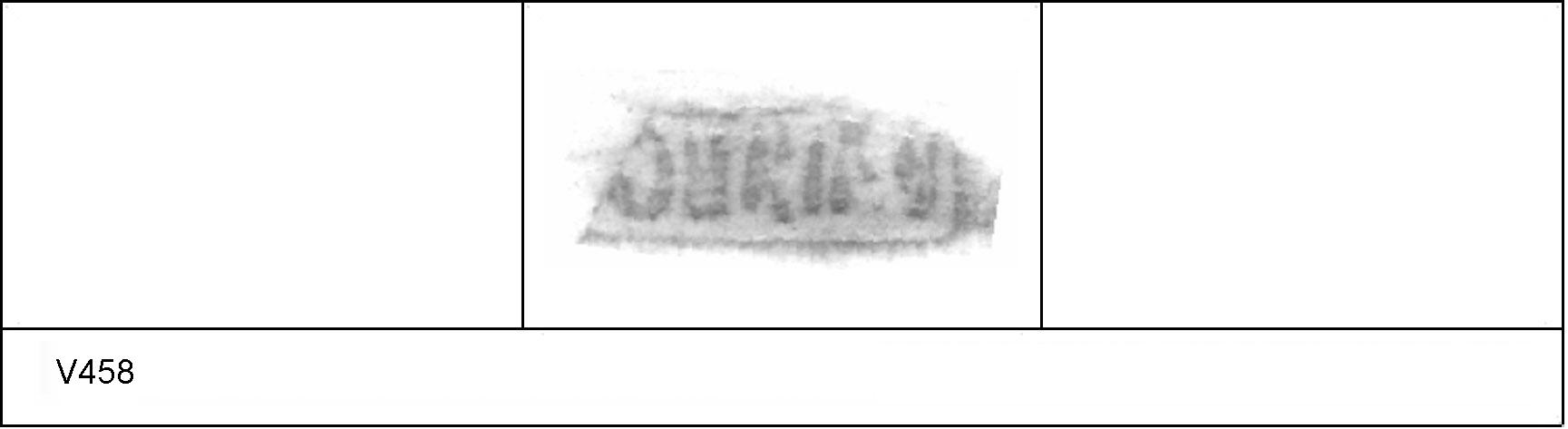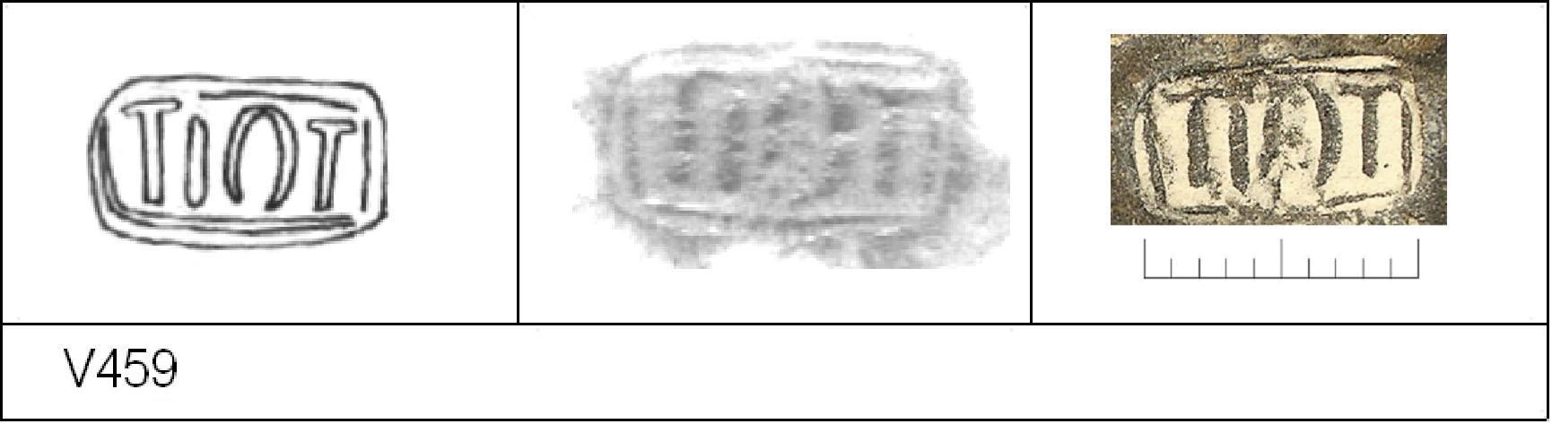 | 458 | 1930-646-647 | Sheepen I | Colchester | Platter | TN | Colchester Museum | 201.31 us. | 132 | 04A01 | R | N | Die 04A01 Radial. TN - white core, grey cortex; black surfaces; polished finish. Uncertain Reading:- SOIIRINI = SOV(I)NI(OS). Alternative rotated reading is (/\((I(OS = C/\SSIIOS = CASSICOS. 2 BRW overstamped. Probably same platter as V457. |