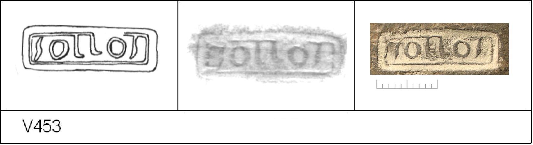 | 453 | 1931H&H | Sheepen I | Colchester | Cam 56 | TN | Colchester Museum | C31BS41 | 38 | 01A01 | C | Y | Die 01A01 V453 Cam 56L. TN - pale fine laminating matrix; spalled surfaces, no finish. Border. Reading:- SOLLOS. Hooked L, flattened S. 1. 1 IC. |