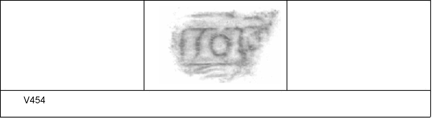 | 454 | 1930H&H | Sheepen I | Colchester | Cam 8 | TN | Colchester Museum | C30BS51 | 38 | 01A01 | C | N | Die 01A01 V454 Central. TN - white powdery matrix; mottled B/G; no finish. Border. Reading:- SOL[LLOS]. Hooked L, flattened S. 1. 1 BRW. |