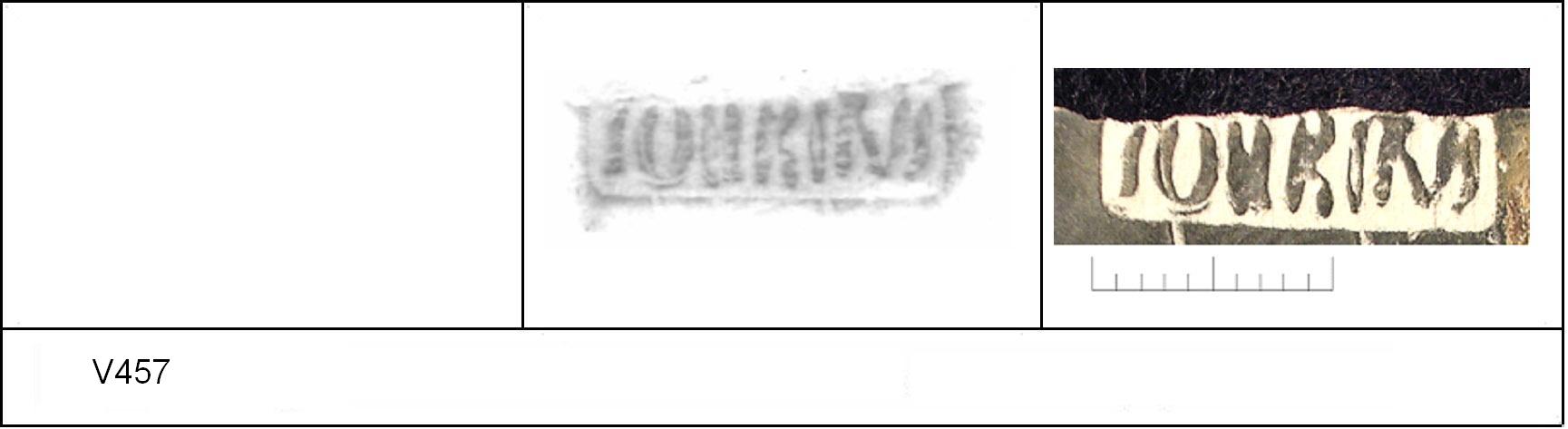 | 457 | 1934H&H | Sheepen I | Colchester | Platter | TN | Colchester Museum | C34BS17 | 132 | 04A01 | R | N | Die 04A01 Radial. TN - white sandy matrix; black surfaces; highly polished upper, matt lower. Uncertain Reading:- SOIIRINI = SOV(I)NI(OS) Alternative rotated reading is (/\((I(OS = C/\SSIIOS = CASSICOS. 1. 2 BRW overstamped. Probably same platter as V458. |