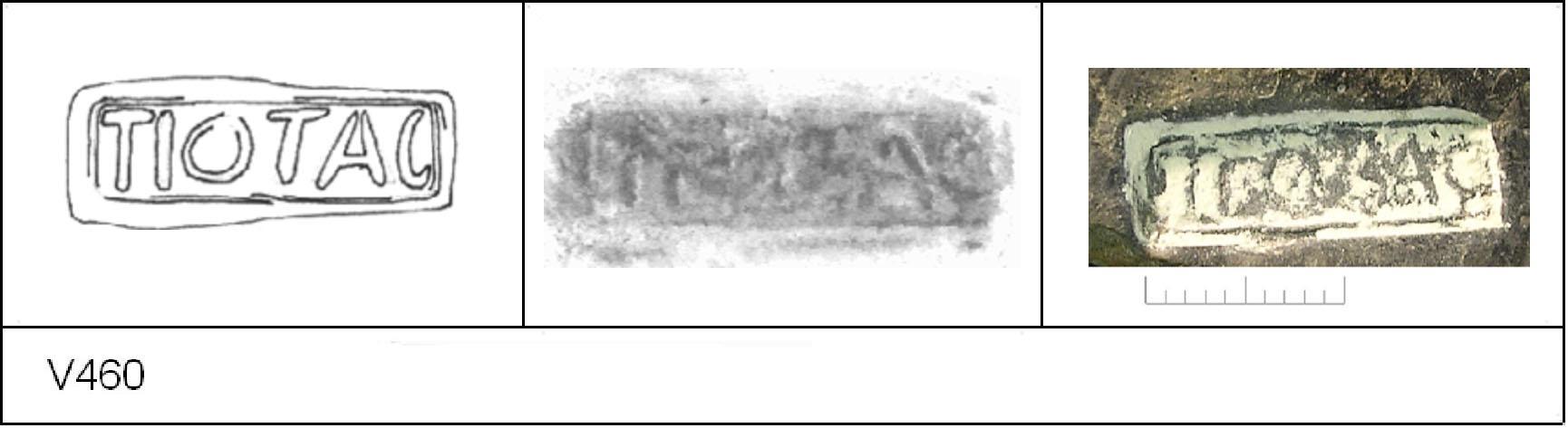 | 460 | 1932H&H | Sheepen I | Colchester | Platter | TN | Colchester Museum | C32BS44 | 45 | 02A01 | C | N | Die 02A01 Central. TN - pale fine laminated matrix; blue-black surfaces; polished upper, unfinished lower. Border. Reading:- TIOTAG. 1. 1 IC round stamp. |