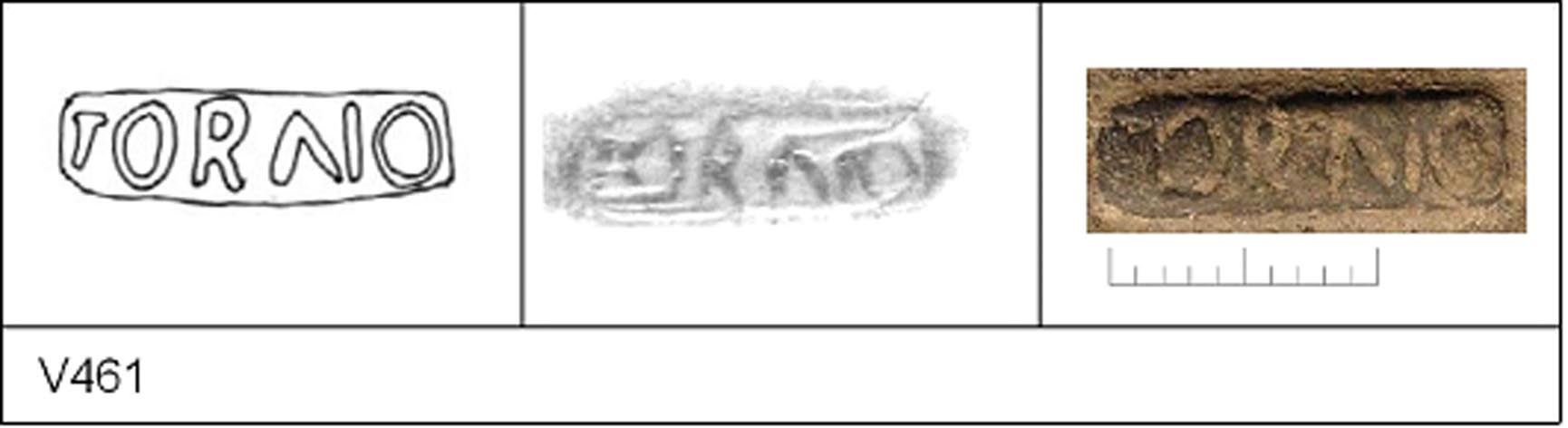 | 461 | 1920 Wheeler | Cemetery unknown | Colchester | Cam 56 | TN | Colchester Museum | 3936.20 | 21 | 04D01 | C | Y | Die 04D01 - TORNO Cam 56L. TN - .pale fine sandy matrix; B/B surfaces; polished finish Reading:- IORNO. No decoration. . CONDITION - complete but for chipped rim. Interior cornice worn away, it looks as if the cup was used for mixing. GRAFFITO on exterior. CONTEXT - probably a burial; found with V244. .? May 1930, pl V, 42 |