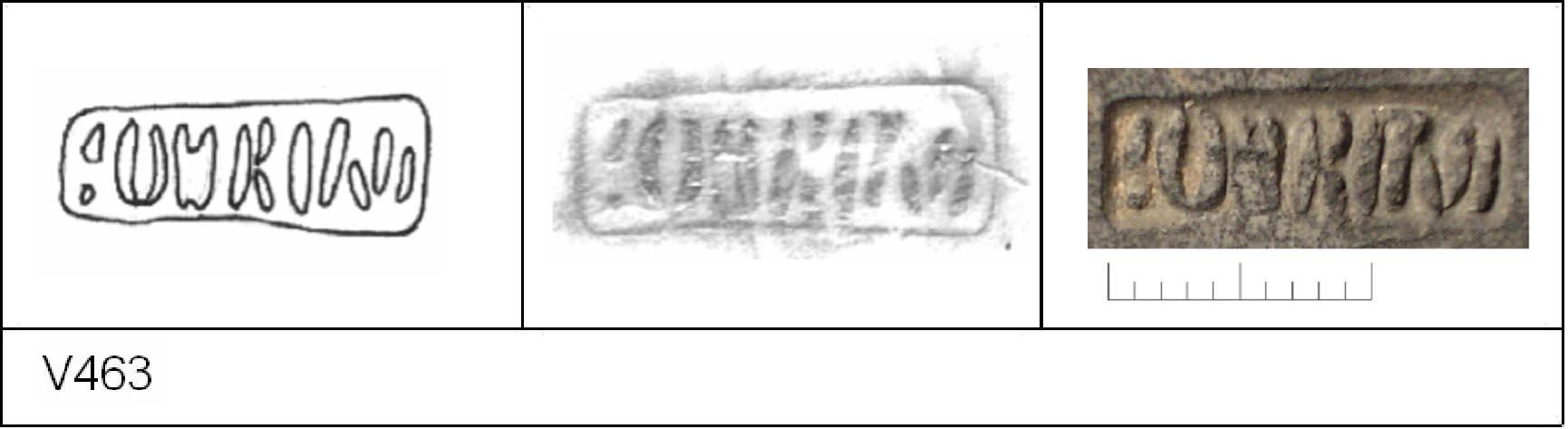 | 463 | Unknown | May 1916 | Silchester | Platter | TN | Reading Museum | 1992.1.1728 | 132 | 04A01 | R | Y | Die 04A01 Radial. TN - pale fine matrix; mottled B/G surfaces; highly polished upper, polished lower. Uncertain reading :- SOIIRINI = SOVRINI or SOBRINI. Alternative rotated reading is (/\((I(OS = C/\SSIIOS = CASSICOS. 1. 1 TIC with BC inside stamp; 1 IC outside. |