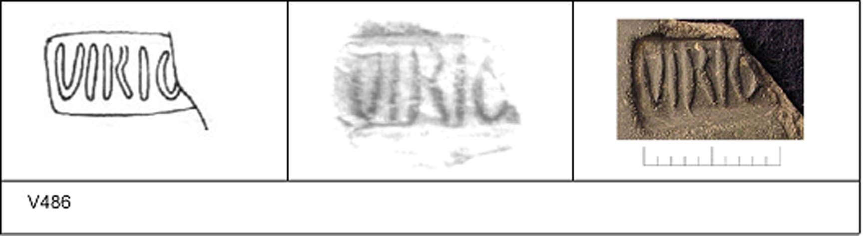 | 486 | 1930H&H | Sheepen I | Colchester | Platter | TN | Colchester Museum | C30B25 | 140 | 01A01 | C | Y | Central. TN - pale fine matrix; dark B/G worn surfaces, no finish. Reading:- VIRIO[DAC]. Tall thin letters. No decoration. | ||