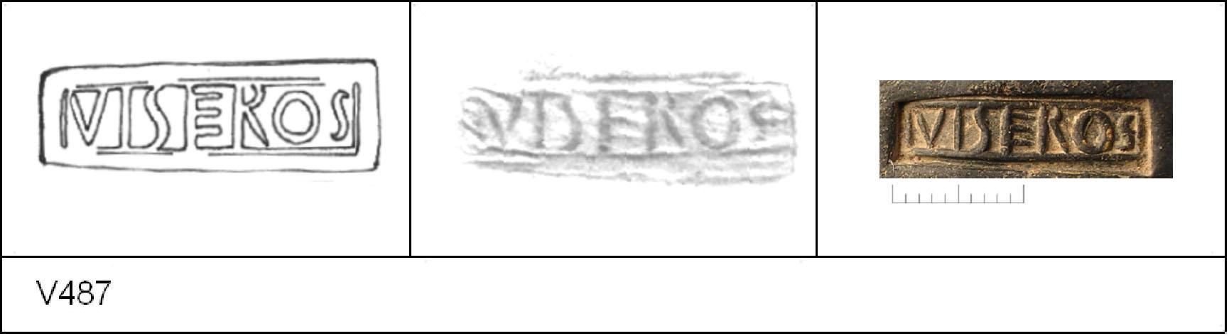 | 487 | P14 4' | Sheepen I | Colchester | Cam 14 | TN | Colchester Museum | P14 4 | 72 | 01A01 | C | N | Cam 14. TN - hard fine sandy white matrix; patchy B/G surfaces; highly polished upper, polished lower.. Border. Reading:- VISEROS. 1. 1 BRW. |