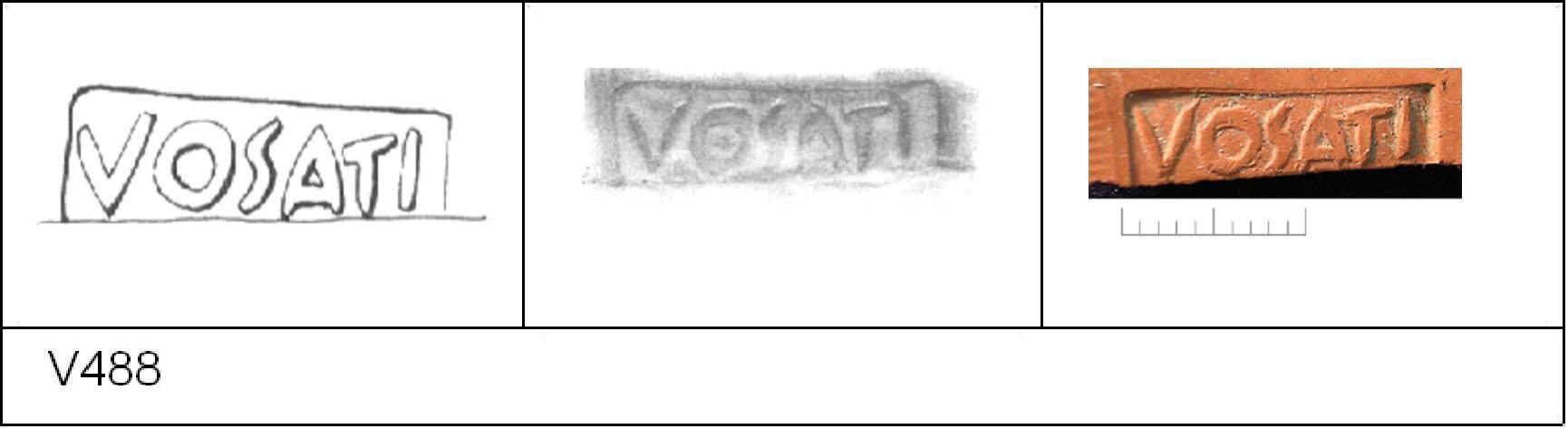 | 488 | IIc (1) | Sheepen II | Colchester | Platter | TR 1B | Colchester Museum | TN9 | 141 | 01A01 | R | Y | Radial; domed base; moulded foot-ring. TR1B - fine orange matrix; darker slip; polished upper, streaky lower. Reading:- VOSATI. 1. 1 BRW, stamp beyond. | ||