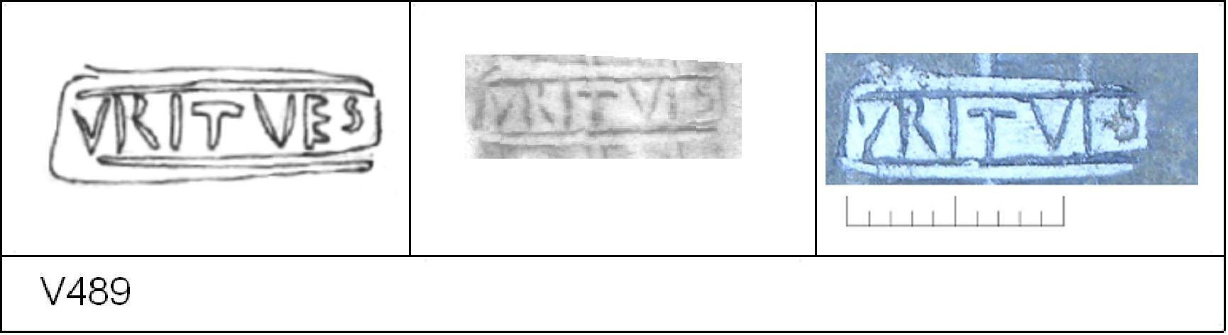 | 489 | 1930-646-647 | Sheepen I | Colchester | Platter | TN | Colchester Museum | 363.31 | 23 | 01B01 | R | Y | Die 01B01 Radial. TN - pale sandy matrix; mottled pale B/G; polished finish. Border. Reading:- VRITVES. Clear but uneven letters. 1. 1 RW. |