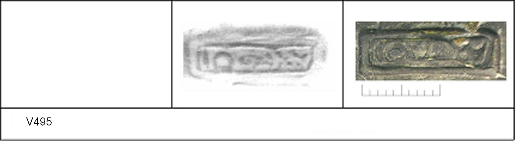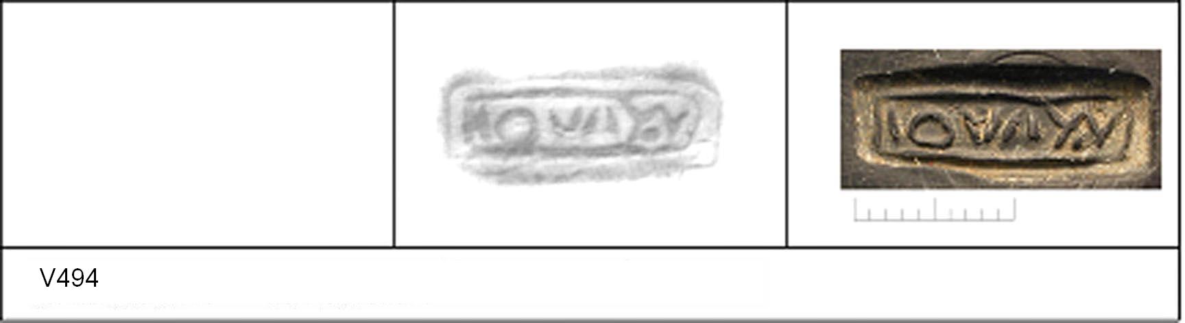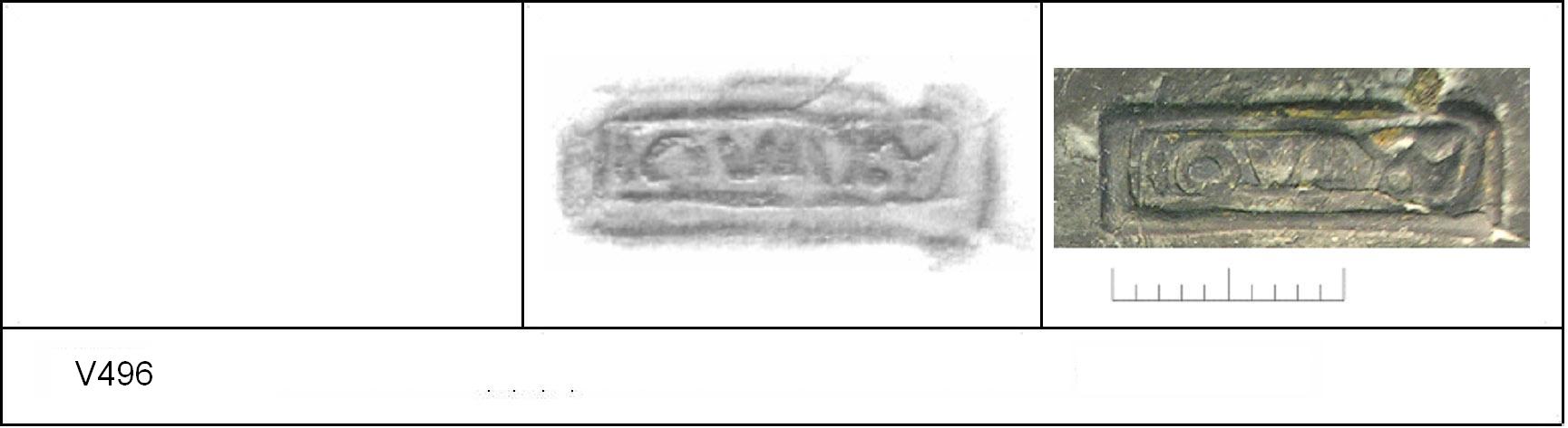 | 494 | IIb (1) | Sheepen II | Colchester | Cam 58 | TN | Colchester Museum | 42 | 01A01 | C | N | Cam 58. TN - rust sandy matrix; G/B surfaces; polished upper, matt lower. Border. Reading:- IOVAY.V retrograde = VX AVO(T)I(S). No decoration. CONDITION - trimmed around base. |