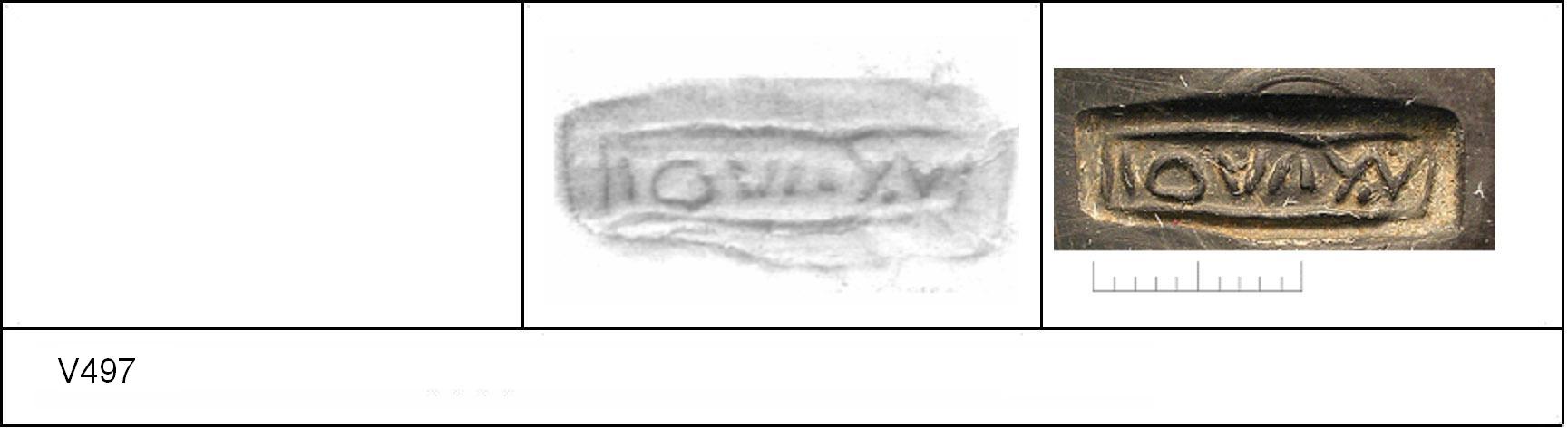 | 497 | 252 | Sheepen II | Colchester | Cam 56 | TN | Colchester Museum | Pit 252 2 | 42 | 01A01 | C | Y | Cam 56L. TN - grey smooth matrix; B/B polished finish. Border. Reading:- IOVAY.V. 1. 2 IC. CONDITION - trimmed base. | ||