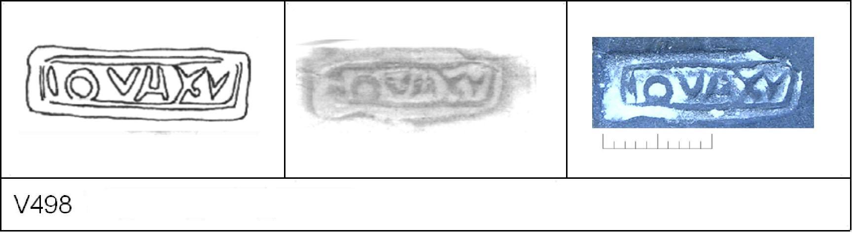 | 498 | 1930-646-647 | Sheepen I | Colchester | Cam 56 | TN | Colchester Museum | 341.31 | 42 | 01A01 | C | Y | Cam 56L. TN - pale matrix; G/B surfaces; polished finish. Border. Reading:- IOVAY.V. 1. 1 IC. |