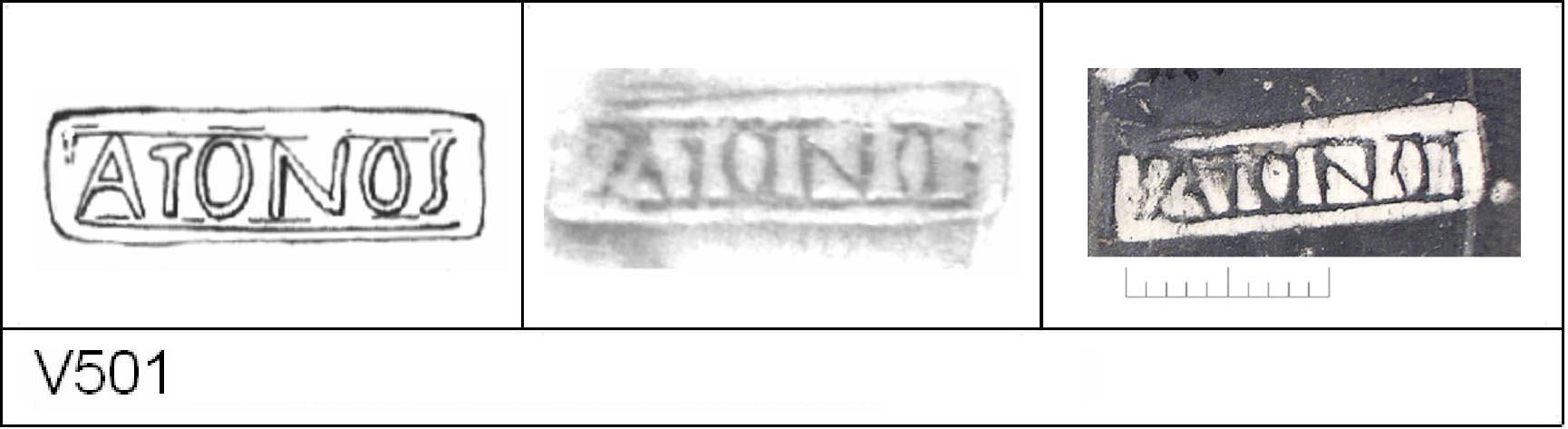 | 501 | 1934H&H | Sheepen I | Colchester | Platter | TN | Colchester Museum | C34BS4 | 142 | 01A01 | R | Y | Radial. TN - pale sandy matrix; mottled B/G surfaces; polished upper, matt lower. Border. Reading:- ATONO. | ||