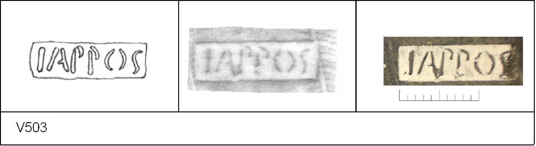 | 503 | Coop Sheepen Rd | Sheepen | Colchester | Platter | TN | Colchester Museum | 28.62 | 15 | 01A01 | R | Y | Die 01A01 Radial. TN - hard dense white sandy matrix; metallic blue-black surfaces; polished upper, matt lower. Reading:- I/-\PPOS. Letter A with bar to right. 1. 1 BRW |