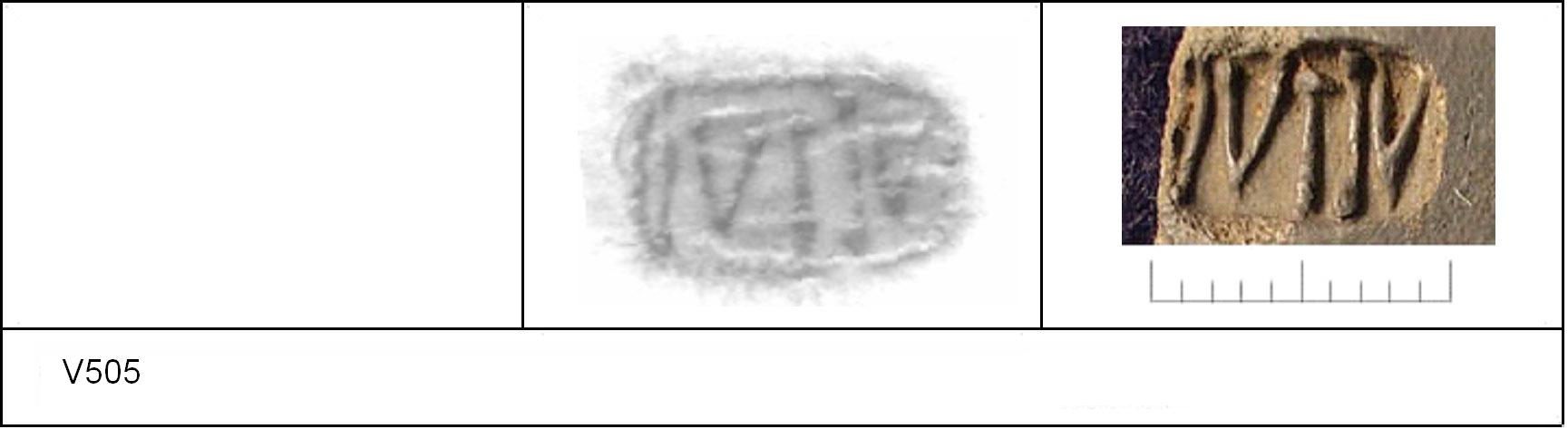 | 505 | 1931H&H | Sheepen I | Colchester | Cam 56 | TN | Colchester Museum | C31BS46 | 19 | 02B01 | C | N | Die 02B01 Cam 56L. Metallic TN - hard fine white matrix; metallic B/G; polished upper, matt lower. Reading:- IVIIV. |