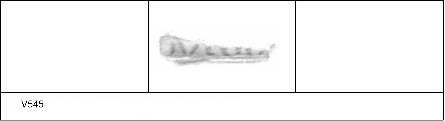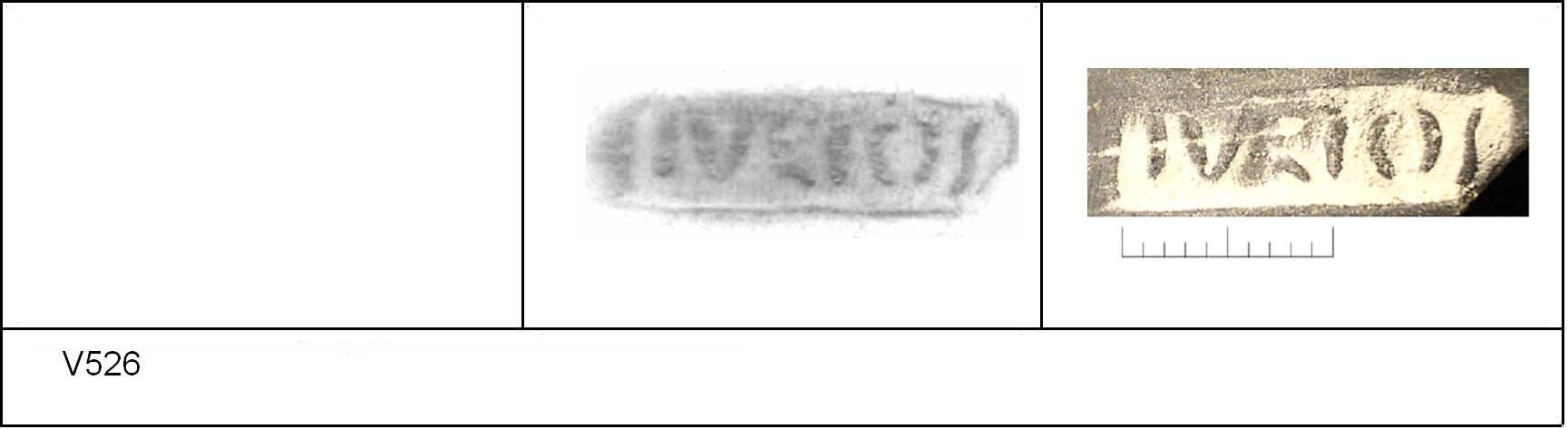 | 542 | Unknown | Sheepen I | Colchester | Platter | TN | Colchester Museum | P9 2' | 18 | 02J02 | R | Y | Dies 02J01, 02J02, 02J04 - IVLIOS/\V = IVLIOS AVOTIS 1 Central & 2/4 Radial. TN - sandy white matrix; patchy B/G surfaces; worn, no finish survives. Reading:- C = [IVLI]OS/\V; R = IVLIOS/\V; R = IV-----V. 1. 1 DIC around stamp + 1 DRW + 1 DIC. CONDITION - 1/2 base circuit. |