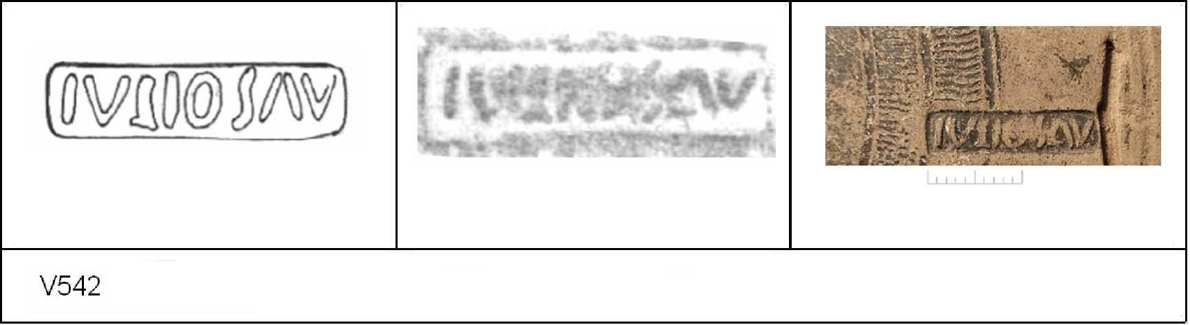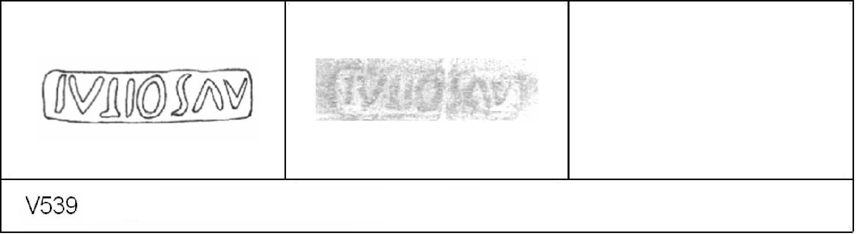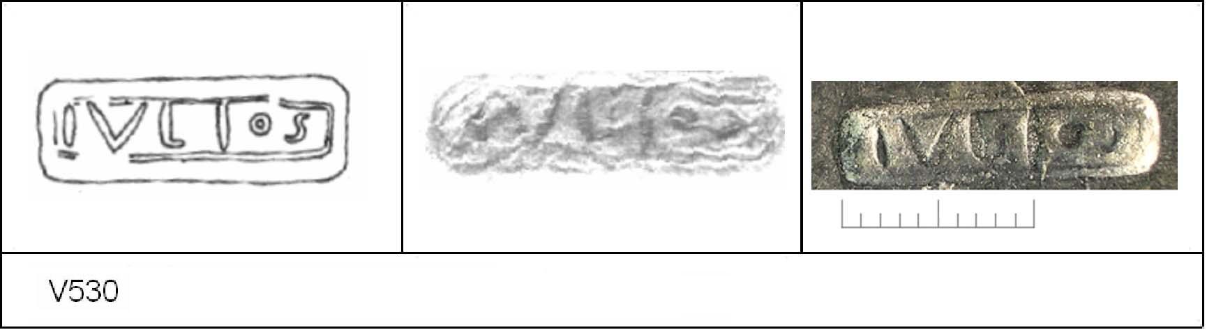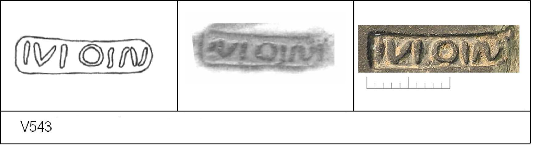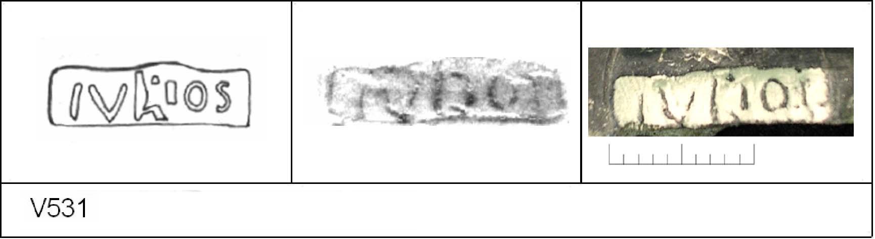 | 538 | BF 6 | Stanway | Colchester | Cam 8 | TN | Colchester Museum | Burial 4 BF6, 13 | 18 | 02J01 | C | N | Dies 02J01, 02J02, 02J04 - IVLIOS/\V = IVLIOS AVOTIS Cam 8 TN - buff fine powdery matrix; B/B very worn surfaces; polished finish. Reading:- IVLIOS/\V = IVLIOS AVOTIS. PAS I. |