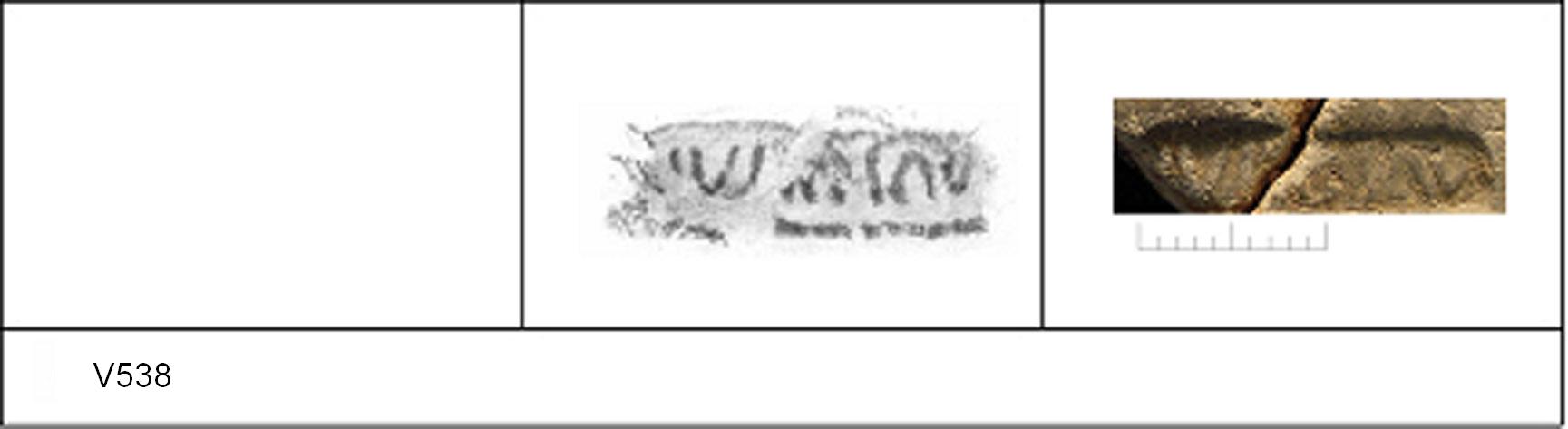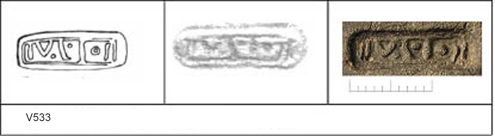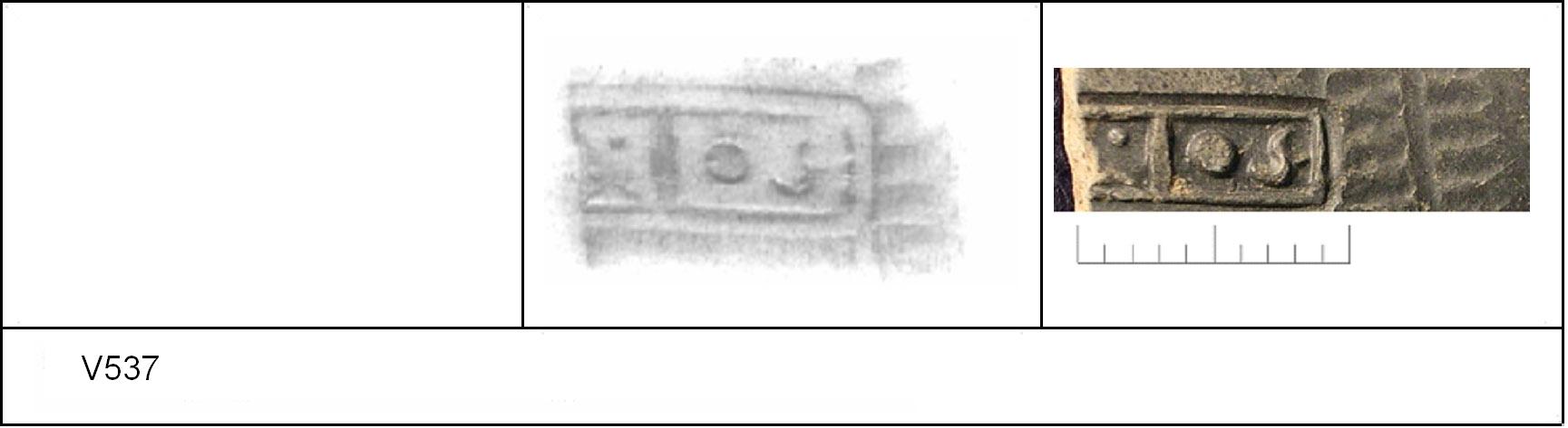 | 537 | Unknown | Sheepen II | Colchester | Platter | TN | Colchester Museum | 18 | 02H01 | R | N | Dies 02H01, 02H02, 02H03, 02H05 - IVL:IoS, L with curled bar, small o and note spots between letters. Radial. TN - hard pale fine sandy matrix; dark B/G surfaces; upper polished, lower streaked polish. Border. IVL:Ios. 1. 8 concentric BC at centre ? 8-prong comb? + 2 RW, inner defined by 1 BC, outer over-drawn by 2 BC. Stamp overlaps outer wreath. |