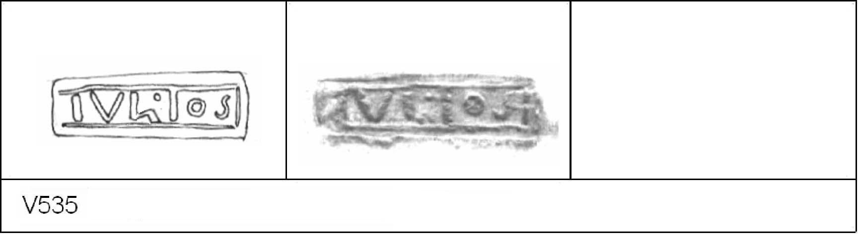 | 540 | 1931H&H | Sheepen I | Colchester | Platter | TN | Colchester Museum | C31BS11 | 18 | 02J01 | R | N | Dies 02J01, 02J02, 02J04 - IVLIOS/\V = IVLIOS AVOTIS Radial, thick base, moulded foot-ring TN - burnt & discoloured; hard pale matrix; no original colour & finish survive. Reading:- [IV]LIOS/\V. 1. 2 x 2 IC + 1DBRW outside stamp. |