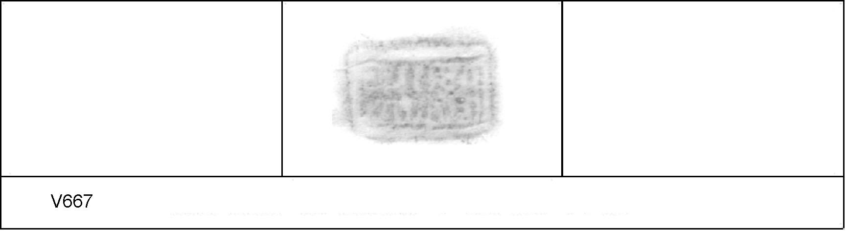 | 666 | BF 6 | Stanway | Colchester | Cam 8 | TN | Colchester Museum | Burial 4 BF6, 15 | 329 | 01A01 | C | Y | Die 01A01 Cam 8. TN - white matrix; light B/G surfaces; polished upper, matt lower. Border. ZP CHEQUER-BOARD. 1. 1 BRW. CONDITION - broken before deposition. CONTEXT - ritual. |