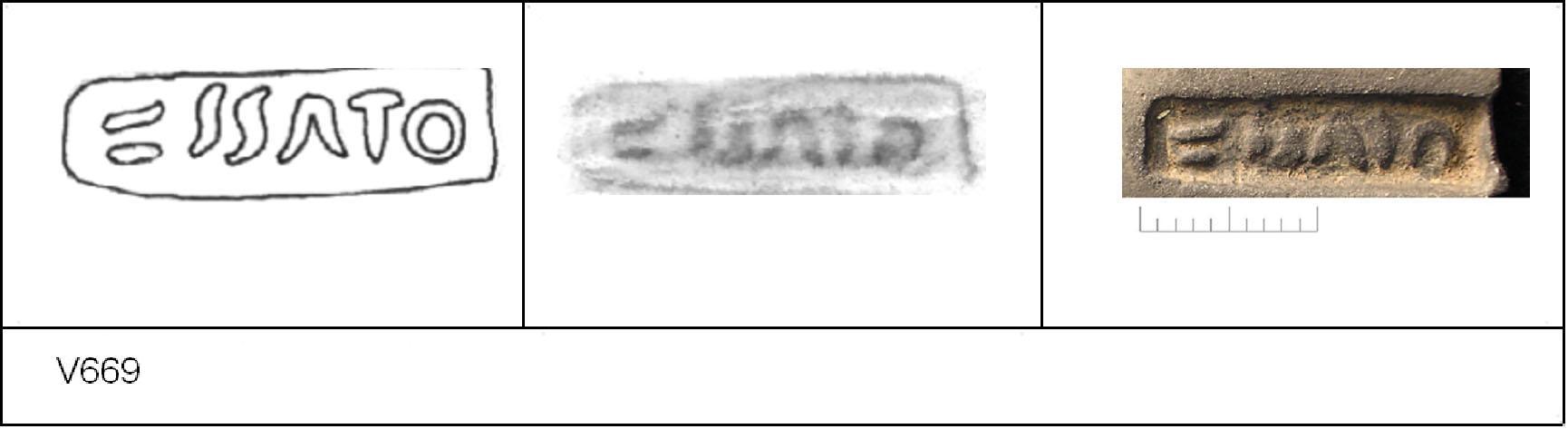 | 669 | Unknown | Sheepen I | Colchester | Platter | TN | Colchester Museum | 13 | 73 | 01A01 | C | Y | Central. TN - pale sandy matrix; patchy B/B surfaces; polished upper, matt lower. Uncertain Reading:- //SSATO =?ESSATO. 1. 3 IC. |