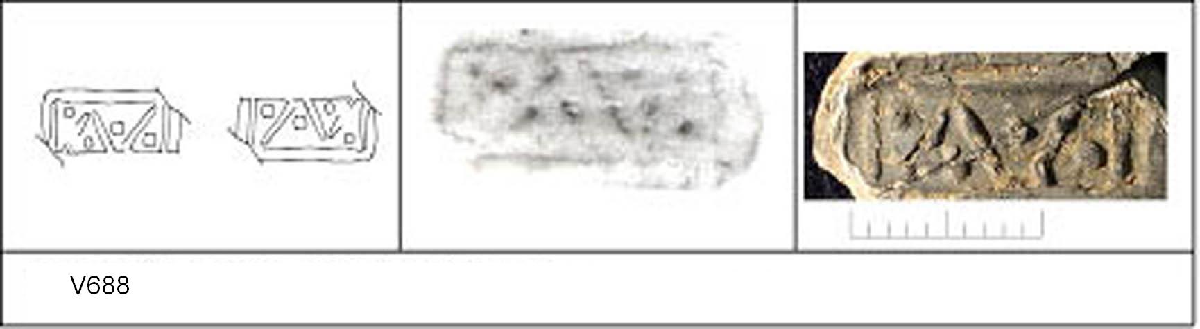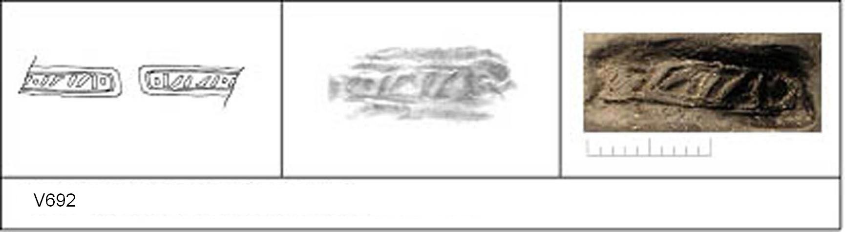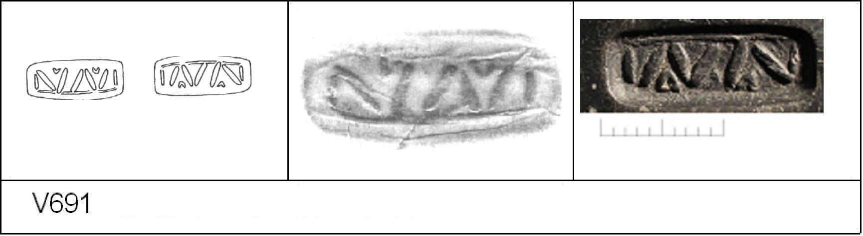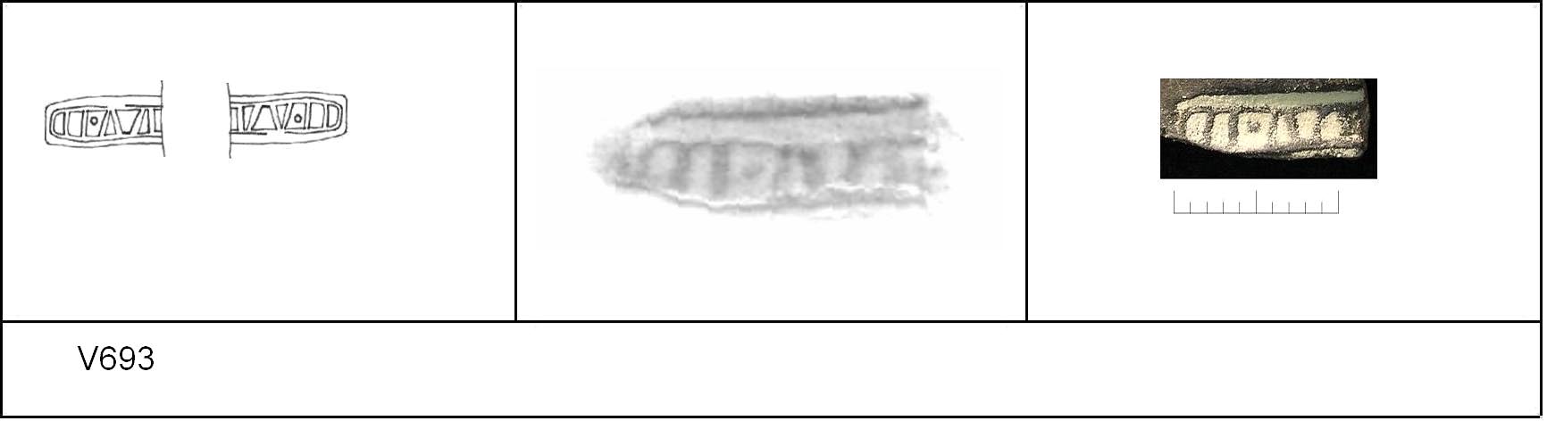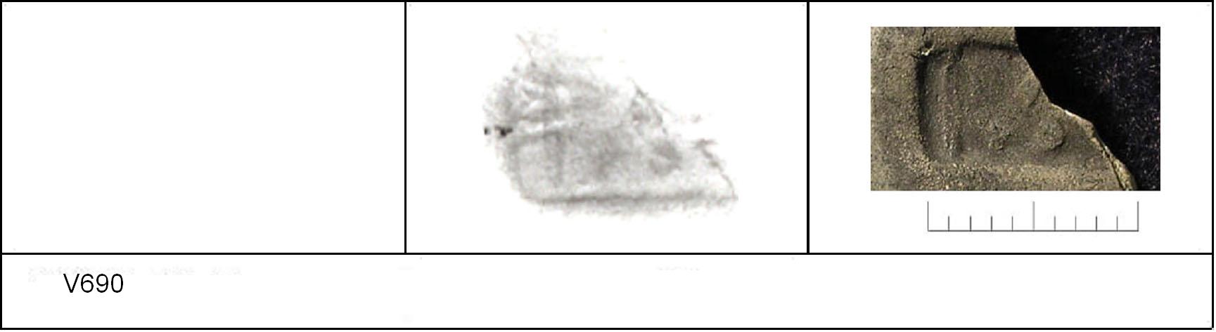 | 691 | Unknown | May 1916 | Silchester | Cam 56 | TN | Reading Museum | 1992.1.1651 | 334 | 01A01 | C | Y | Cam 56L. TN - pale fine matrix; black surfaces; highly polished upper, matt lower. Border. Mark:- /.\//.\ or \'//\'/. Spotted \/- & /\-motifs. 1. 1 IC. CONDITION - trimmed around cornice. |
