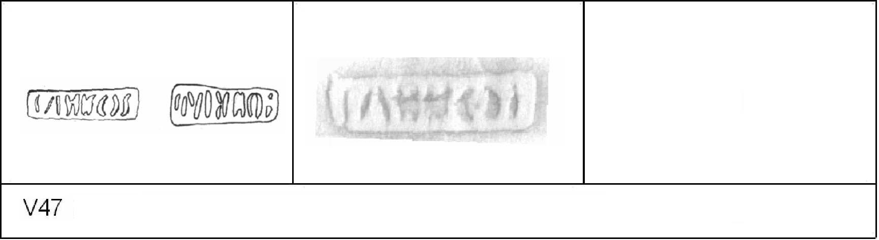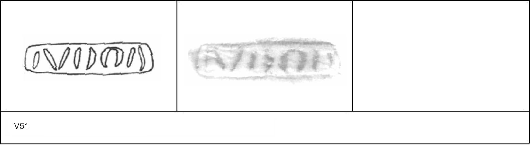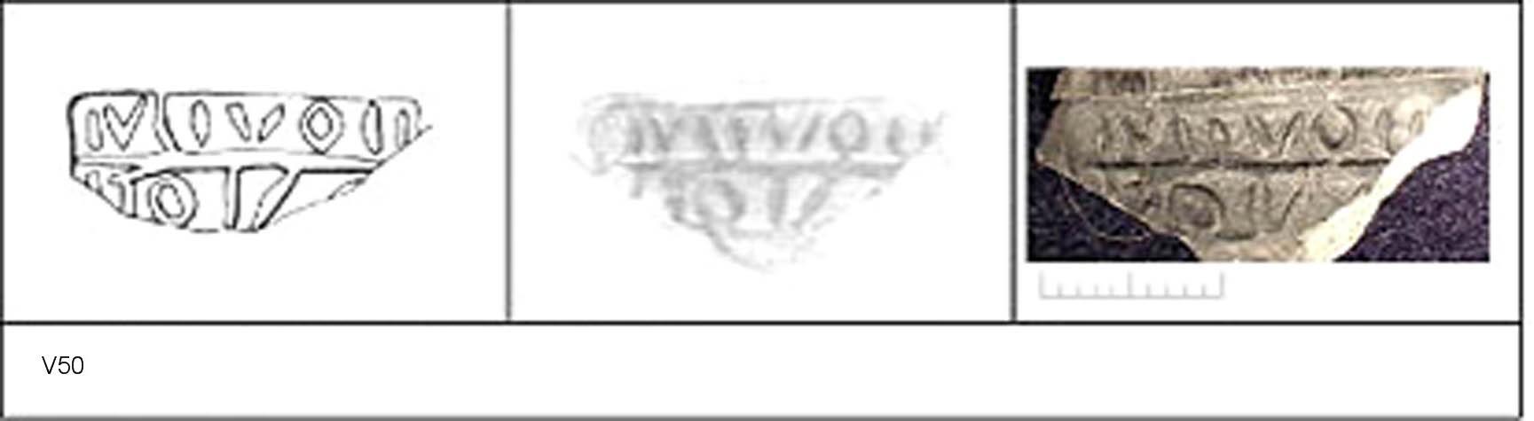 | 50 | Unknown | Museum Collection | Chichester | Platter | TN | Chichester Museum | 308 | 357 | 01A01 | C | Y | Central. TN - pale fine sandy matrix; B/B surfaces; highly polished upper. Uncertain Reading:- I\/II\ /O(I [_] /{_] ITOV[_]. The lower line probably reads AVOTIS retrograde. No decoration. |