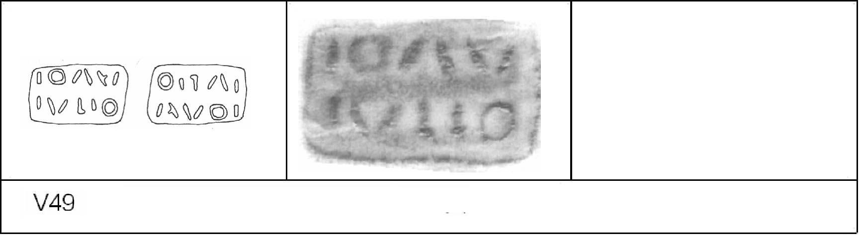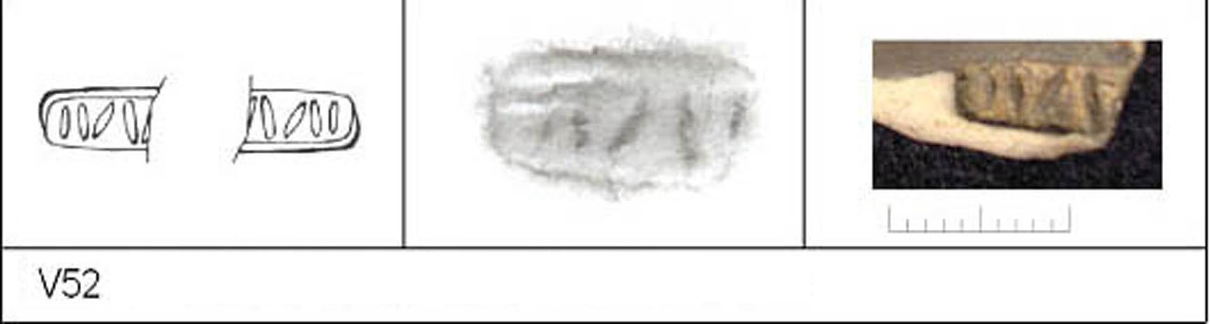 | 48 | A52/61 | Theological College | Chichester | Cam 5B | TN | Chichester Museum | A52/61 | 34 | 01A01 | R | N | Cam 5B, Radial. TN - pale fine sandy matrix; dark B/G surfaces; very abraded no finish survives. Border. Reading:- CIC[/-\RV]. 1. 2 BRW. A complete version of the die is published in Down & Magilton 1993. | Down & Magilton 1993 | |