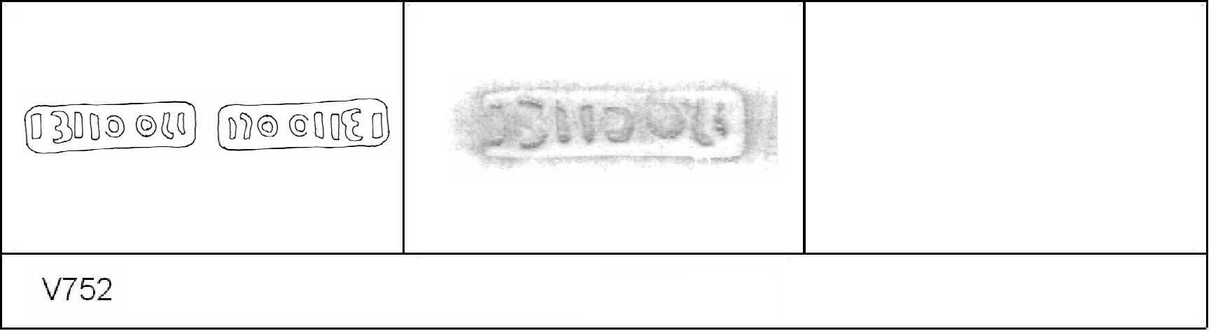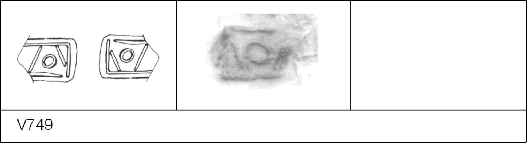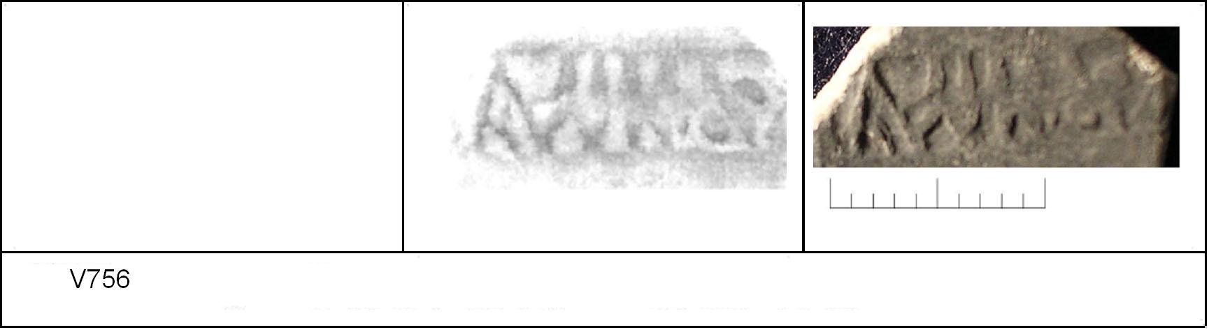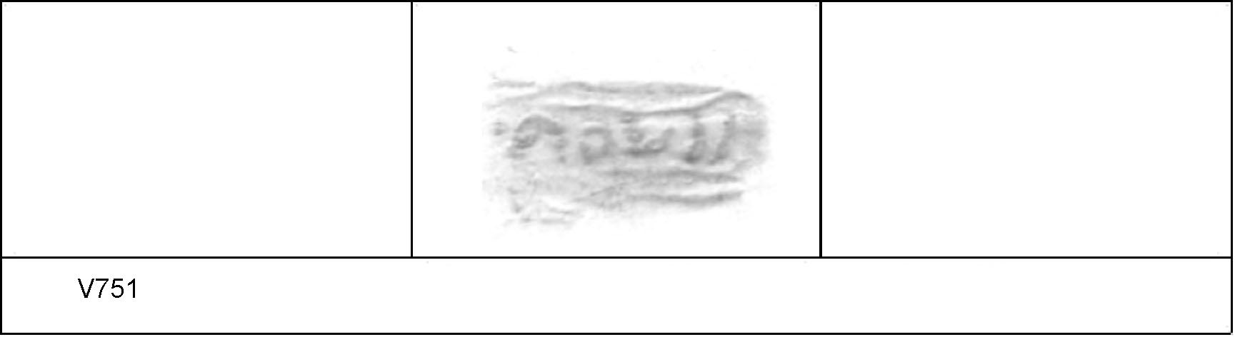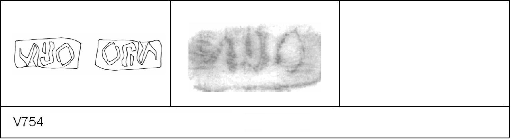 | 751 | A57 | Clothall Rd | Baldock | Platter | TN | Letchworth Museum | TV/ND 297 | 234 | 01A01 | C | Y | Central. TN. Cursive:- II/\OV[___] or [__]/\OVII. 1. 2 light IC. CONTEXT - Pit A57 AD 1-25, but stamp is Claudio-Neronian. Similar stamp at Exeter - V763 P309 Die 01A01 |