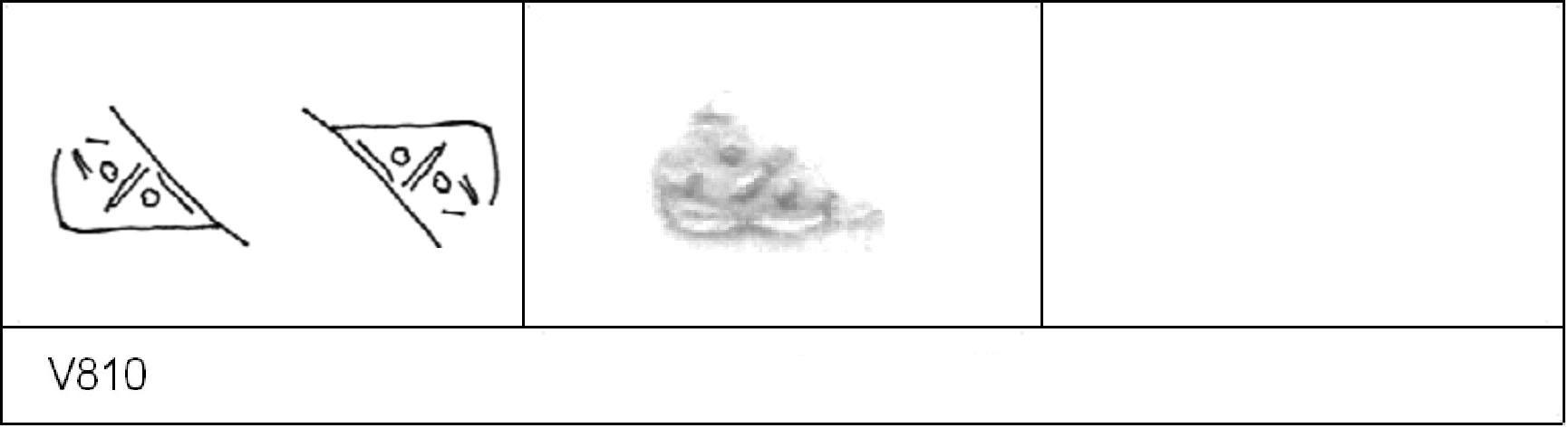 | 822 | 1931H&H | Sheepen I | Colchester | Cam 56 | TN | BM | C31BS37 | 332 | 01A01 | C | Y | Cam 56. TN - pale grey matrix; G/B surfaces; highly polished inner, polished outer. Border. Mark:- ZM I\I 1. 1 IC. | ||