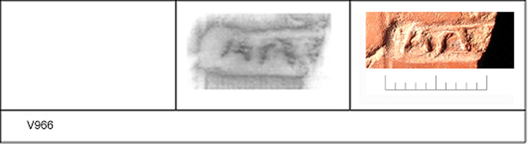 | 966 | (424) | Basilica 1980-6 | Silchester | Platter | TR 1C | Hants Co Museum | 424 972 | 32 | 03B02 | R | N | Die 03B02 - ACVTII Radial. TR1C. Reading:- ACV[ ]. Same platter as V965. Identification of V965-6 not certain but style is closest to Acutus II and cannot be paralleled in Attissu Die-groups. CONTEXT - residual. |
